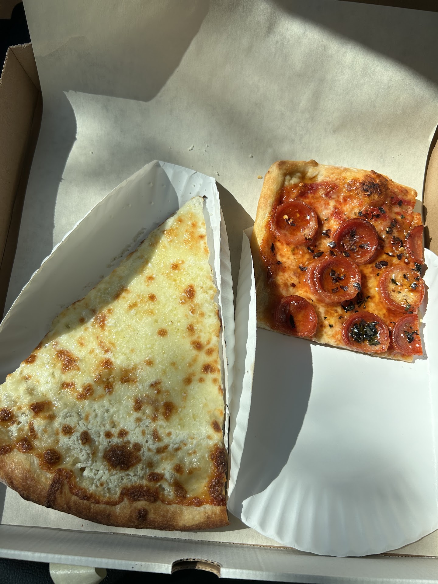 Definitely a hidden gem. Came in on a whim because I saw good reviews and was on the hunt for a good slice to go. There were several pizza options in the display and ready to order which I love about a pizza spot. I ordered a Sicilian sausage/red pepper, pepperoni hot honey and a white slice. I would have stayed to eat at one of the few small tables but the baby was in the car. The pizza looked so amazing I ate some right in the parking lot it did not disappoint. The crust on the Sicilians was perfect and flavor was delicious. White pie was also simple and perfect. Can’t wait to try the cheese!