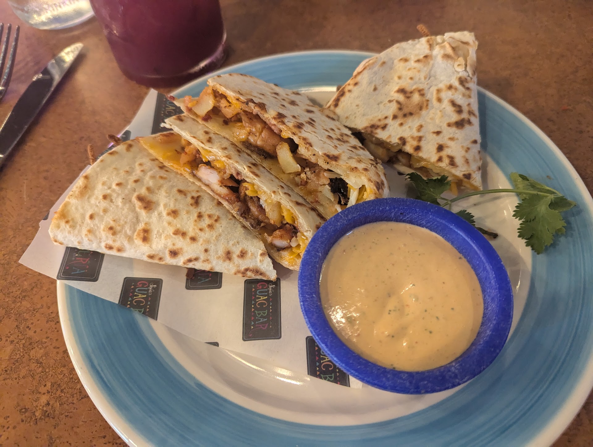 The service situation did improve from there though. I got the blueberry ginger margarita, and my chum got a paloma. Both received top marks, and hers was served in a very edgy pottery-esque cup with a nice looking rim. We also both really liked our entrees. I went with the shrimp/chorizo quesadillas, which were tasty and VERY quickly served. I think we had our food within about 10 minutes of ordering, which arguably canceled out at least some of the earlier service issues. My chum was a little leery of how quick it was, but my argument would be that a lot of this genre's made-to-order options (if it was made-to-order) ARE fast by definition. Regardless, would 100% get that again and it was probably the highlight for me. I don't like crunchy shizzle in food, which typically makes Mexican not the go-to genre for me, so it was nice to find something that didn't have tons of salsa, onions, peppers, etc. roaming around.