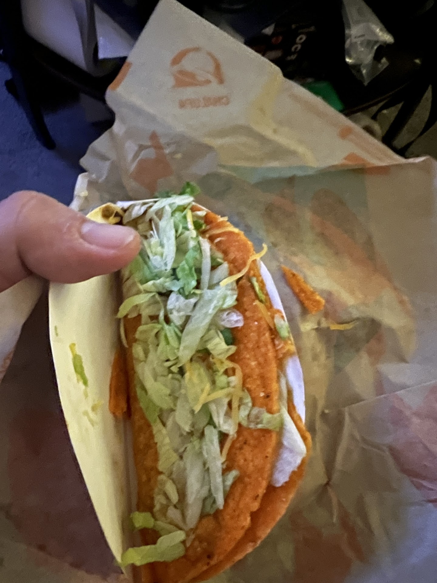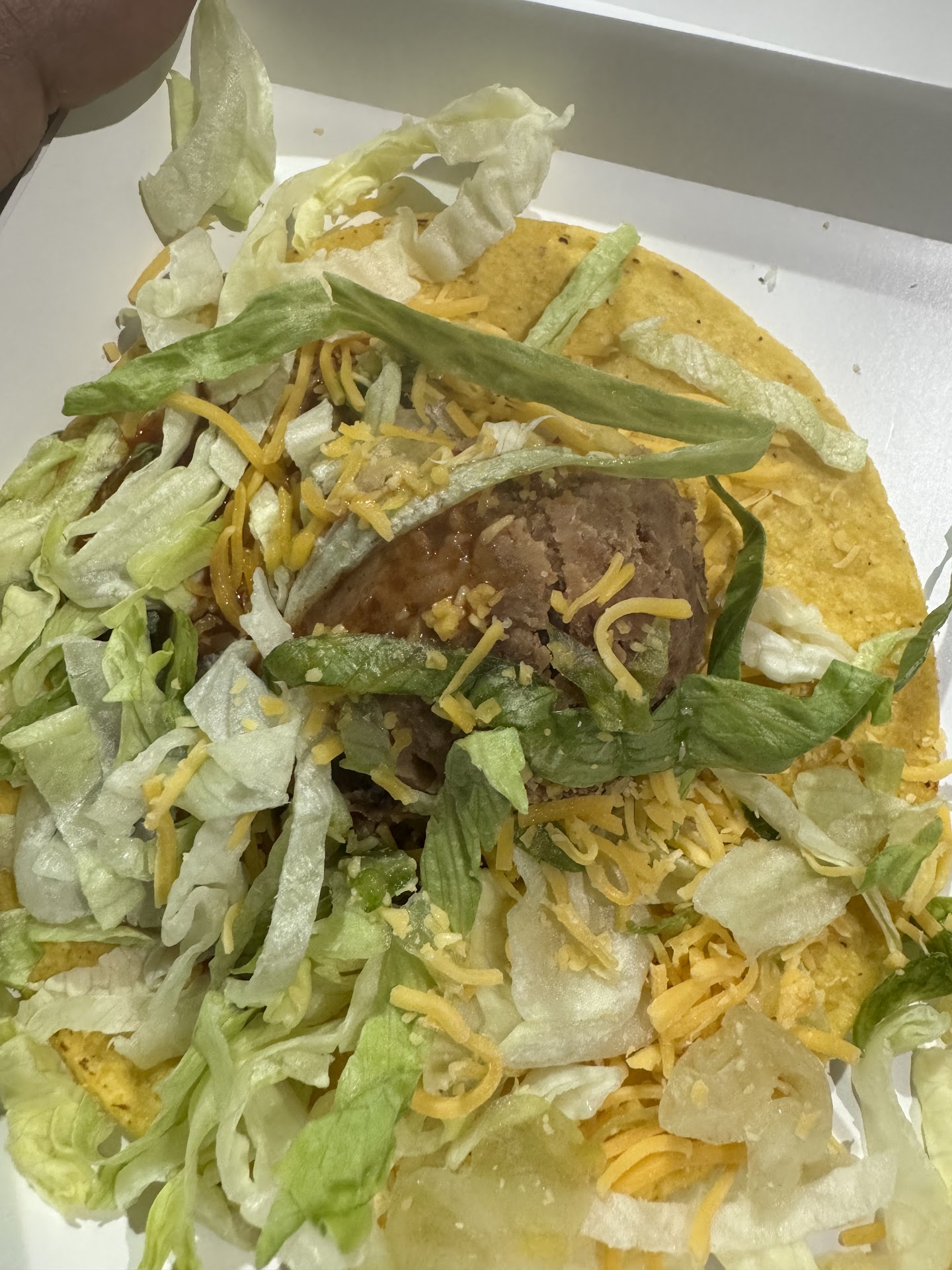 Ā Ā Ā Read moreI have unfortunately been eating at this location as itās closest to my house for years. Itās consistently below average even compared to other Taco Bellās. I will often drive extra to avoid it, but I still do occasionally eat there and generally regret it. My most recent experience, hopefully will be the last time I buy food here. The beans were so dry and crumbly and disgusting and still in the shape of an ice cream scoop they came out of. Some of The lettuce was frozen. Iāve worked in the restaurant industry in the past, and I would be ashamed to serve this type of food. I would never serve this to anyone. As this has been going on for years, itās not just a manager issue, but also a regional manager issue. Why do other Taco Bellās have the ability to put out consistent food and creamy beans all day where this restaurant can only do it sporadically. This is not a tostada. Taco Bell rant over. Do better please, your quality is shameful even for Taco...