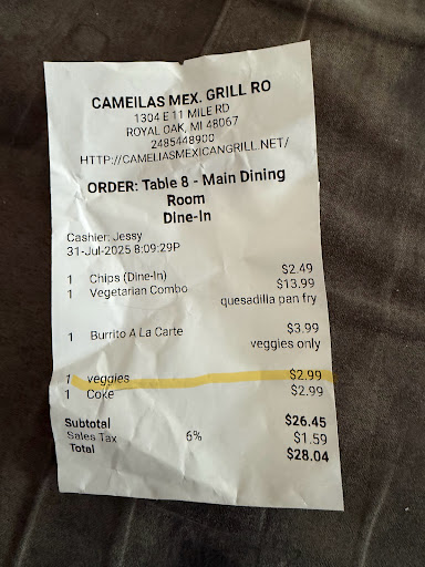 Read moreI’ve been coming to Camelias since I moved here a few years ago as it is my favorite Mexican in town. The guac is delicious! I love the fresh chips and salsa and I have always gotten the steak quesodillas and they are awesome! This time I got the steak quesadillas and they were different (on fried flour tortillas) I looked on the menu and saw they changed them so completely my fault and they were still good! Just not what I was expecting. I didn’t eat much of them cause I wasn’t hungry and the manager (I’m assuming) came up to me and asked if everything was alright as she noticed I didn’t eat much of my food. I told her everything was great I just wasn’t hungry. And she kept asking to make sure I was happy. I told her that it just wasn’t what I was expecting and she went above and beyond asking if I wanted her to make it grilled (the way they used to make it) and I told her it was okay! I loved how above and beyond she went to make sure us, as guests, were happy! We still would have gone back because it’s my favorite but I’m so happy to support a business who cares so much about their customers that I had to share!! Support small businesses who go above and beyond to make sure everyone leaves happy and full!! As we walked out the door she pulled me aside and told me when we come in again to ask for it grilled so I got what I was expecting next...