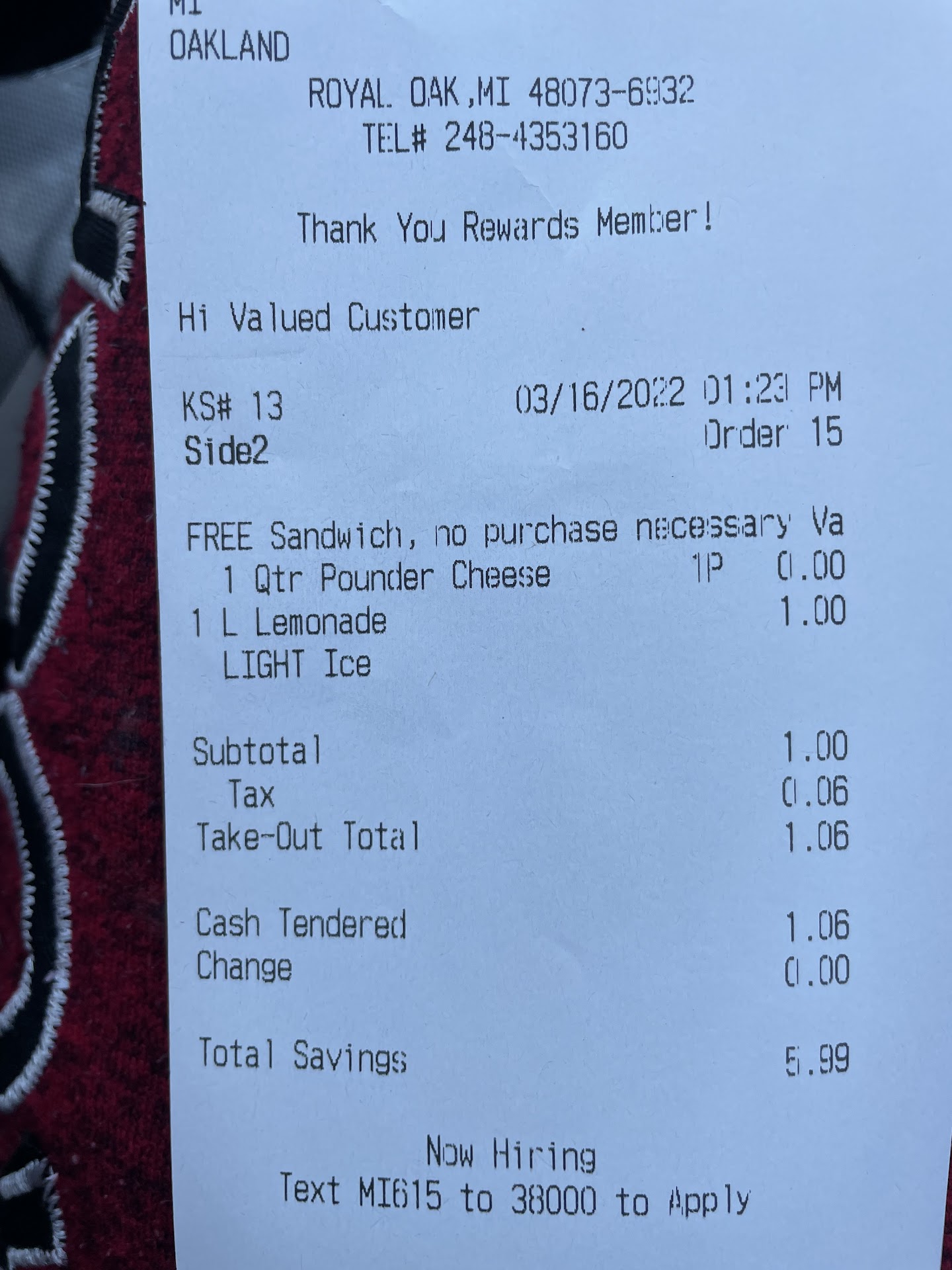 Last, but not least, no military discount. So, no supporting our own country's military. Military that defends the freedom of the owner of this McDonald's. PATHETIC!! There are plenty of McDonald's that don't charge for extra sauces, give a water cup bigger than 3 oz., you are allowed to get your own napkins, not made to feel like a criminal at the drink machine with cameras in your face, AND give military discounts (like the one in Mt. Clemens! GREAT McDonald's!).