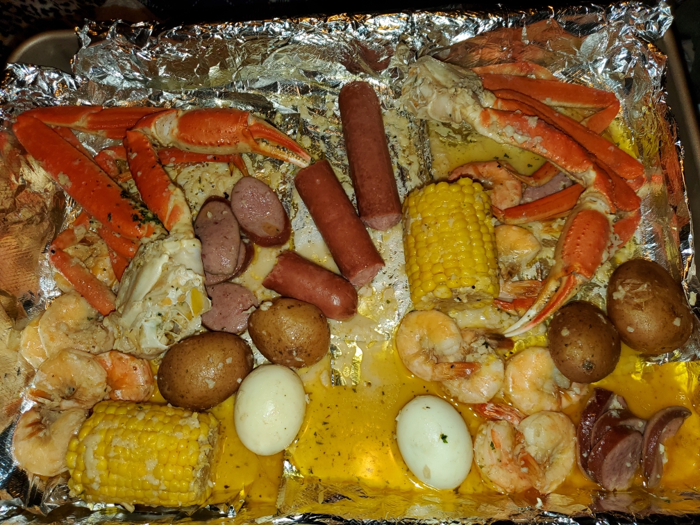 (Online order)I ordered take out from this place last night, and I am super stoked that I did! That seafood boil was so frickin' delicious I kept looking back at the menu as if it would change. I ordered the Special Steamed Mega Combo Plate. It came with 2 snow crab leg bunches, 12 shrimp, 1 corn, 1 potato, and sausage; in garlic butter, medium spice aka no spice~. I ordered an additional corn, potato, and egg. I also added my own sausage to the dish when I got home (the long sausages in the middle of the picture), as they were a really skimpy on the amount in the boil. There were 8 slivers, not slices, of sausage (which can be seen next to the long sausage, and in the bottom right hand corner).The dish itself was $37.99, the three add ons were $1 a piece, a $1 convience fee, and taxes totaled the boil to $44.85. So, I do wish I would have considered their other boils based on quantity vs. price. I do feel I was misled by the menu saying 2 snow crabs, as I assumed I would be getting both sets of legs on the crab, totaling to four bunches of legs. Not the case at all, you get both sets of legs from 1 crab. I shared this with my kid, and we were both full and satisfied. I will be coming back to try...