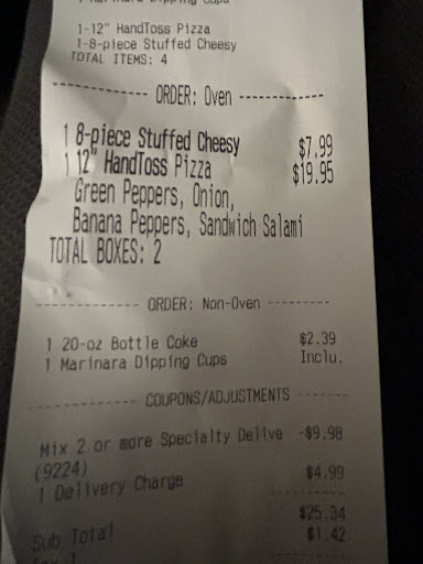 Read moreNever ordering from here again. 4 times in a row and they messed up my order each time. They forgot dip cups on two of the orders and wouldn't offer to make it up on my next visit. The straw that broke the camels back was when I ordered online for delivery and it took them two hours. I called after 45 minutes and they reassured that my pizza was on its way. After another 45 minutes I called and asked for the manager who told me they dont deliver to my apartment, although they have delivered for my roomate at least 100 times. The manager raised his voice to me when I calmly explained this, arguing that I didn't know what I was talking about. I, at that point, stopped being polite and told him that he needed to make this right or he would probably not have a job after this. He came and delivered them himself and told me they were free. They were old and not edible. They could have remade the pizzas at...