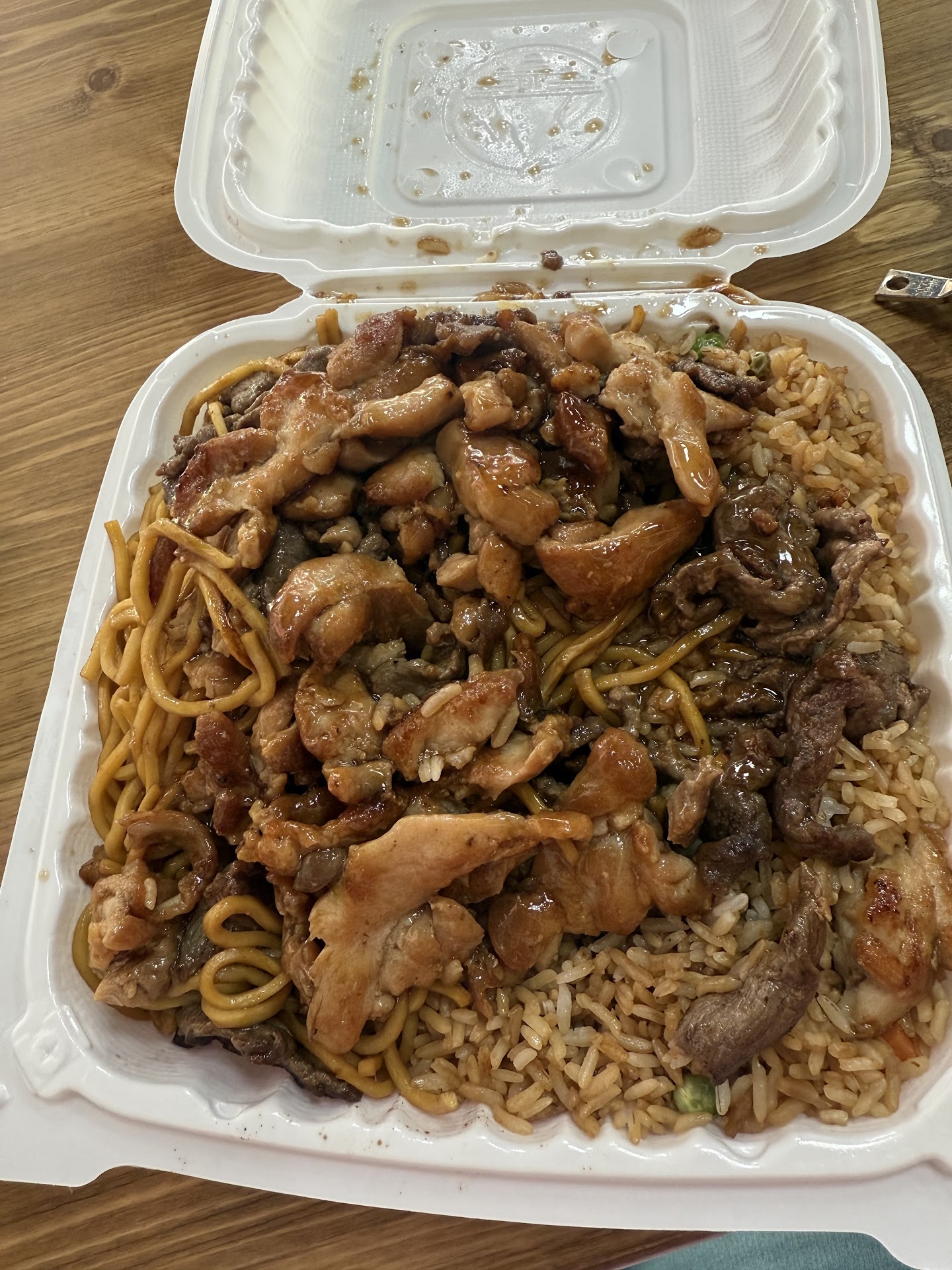 The hibachi meals were enjoyable overall. The noodles had a delightful chewy texture that complemented the chicken well. However, I would describe the experience as âgoodâ rather than âabsolutely deliciousâ since we found the noodles to be very dry, even with the extra sauce. This is something that could be improved to enhance the overall dining experience.