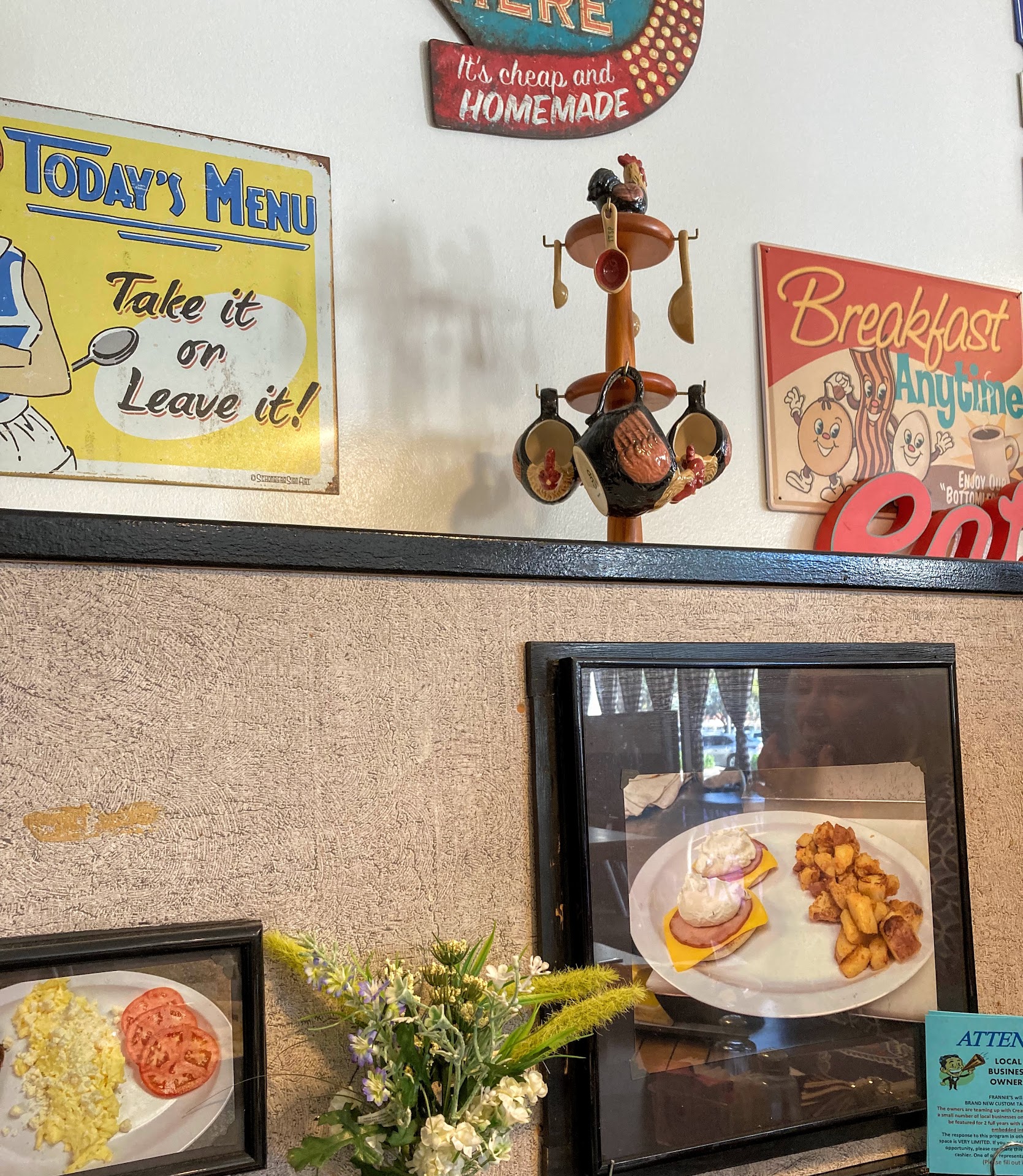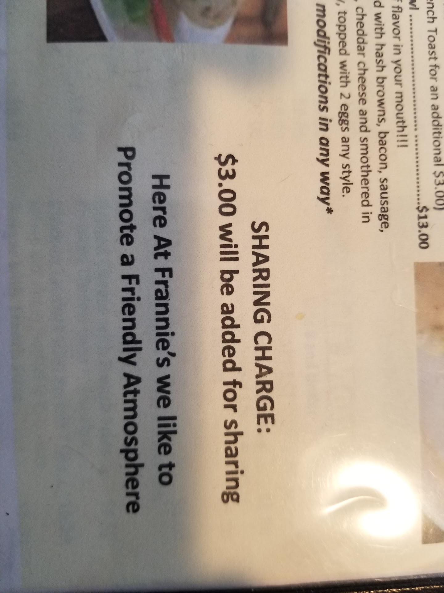 This was perfect - person who served our order put toast down in front of my Wife, then asked who got the "dry" toast (I asked for butter not margarine). TWO people at the table and you can't figure out who gets the other toast? This was THE MANAGER or OWNER! Bright light.