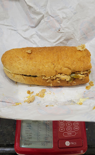 Upon getting the sandwich home, I immediately unwrapped it and noticed that it had barely any meat. I weighed the sandwich and found the entire "Giant" sub to weigh a total of 18 oz. Yes, that's right, 18 oz. for the "Giant" chicken Philly. I scooped out the filling (chicken, onions, peppers, and cheese) from one half of the sandwich and found it to weigh 2.5 oz. So for a "Giant" sandwich, there is a grand total of 5oz of meat/cheese/veggies and 12oz of bread, and 1oz of wrapper. It seems that they probably use the same amount of filling for a regular and Giant sandwich but only change the size of the bread. If they actually gave less meat on the regular, that would be mindblowing.