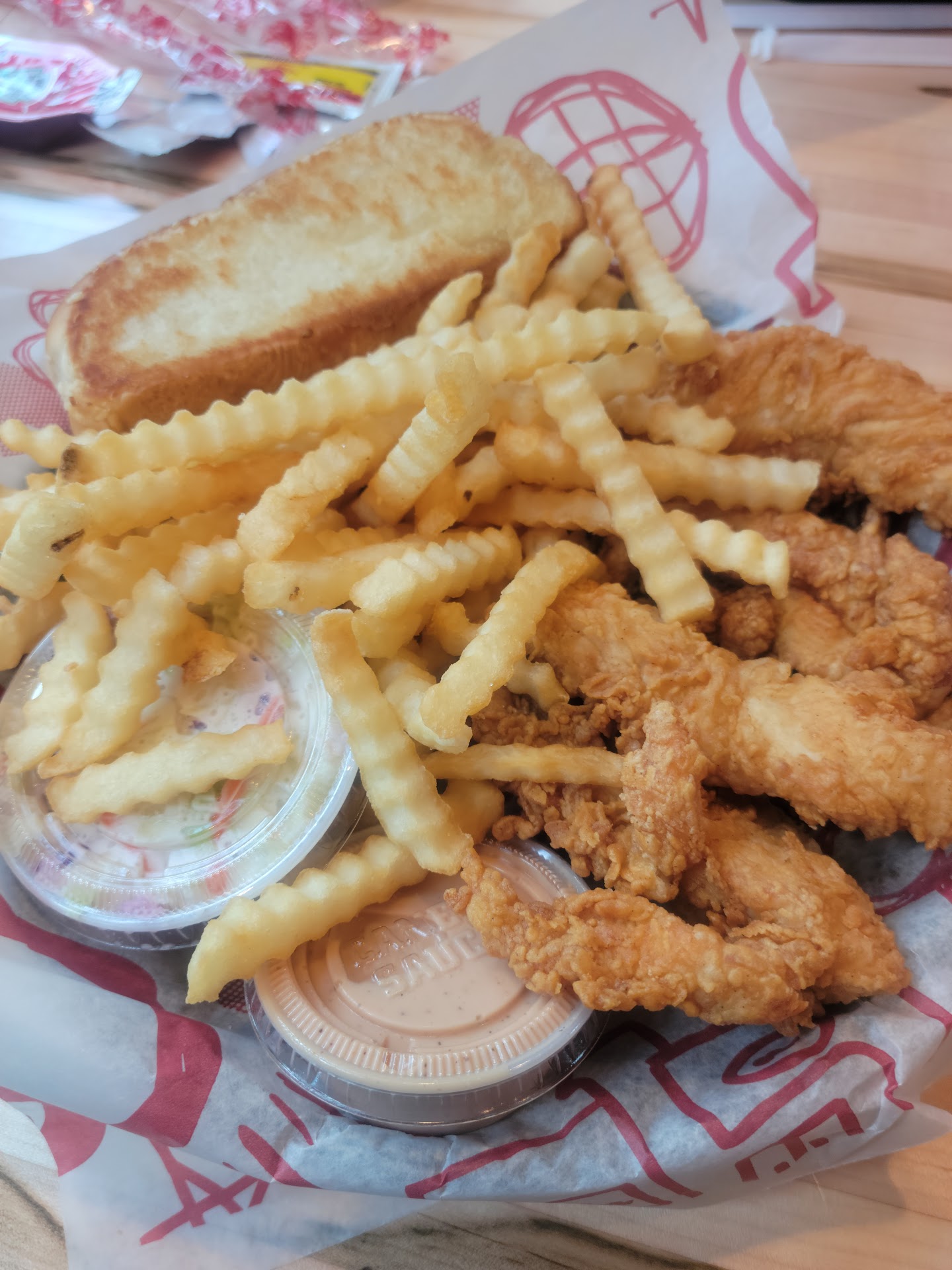 Complementing the chicken are the crinkle-cut fries, always served hot and crispy, and the Texas toast, which is buttery and grilled to perfection. For those who enjoy a bit of variety, the coleslaw adds a nice crunch and a refreshing balance to the meal.