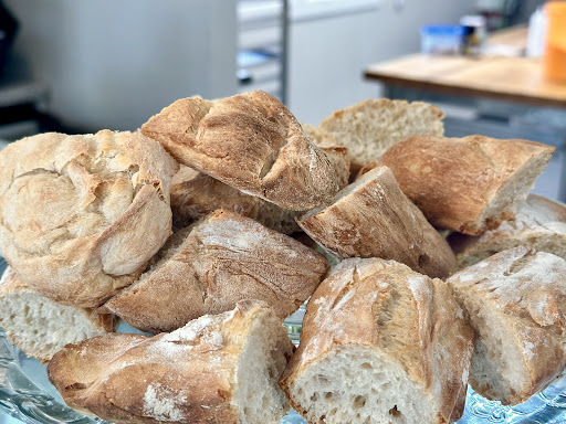 Read moreWe love this quaint bakery. It is bright and inviting, and in a pretty convenient location. You can see them working back in the kitchen, which is neat. They have a legit espresso machine, and a coffee menu. The food is what you have to try, though! Our kids can vouch for the amazing cinnamon rolls and gigantic, buttery turnovers. The artisan breads are SO good, too. (Crunchy baguettes!!!) Homemade breads. I saw lemon meringue pie, and a carrot cake while we were there, but haven’t tried them yet. Looked awesome though!