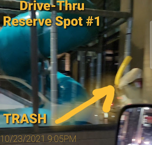 Also Fun Fact! The Drive-Thru Reserve Spot #1 has a box of trash in front of the window stacked 5ft high, behind the play place.