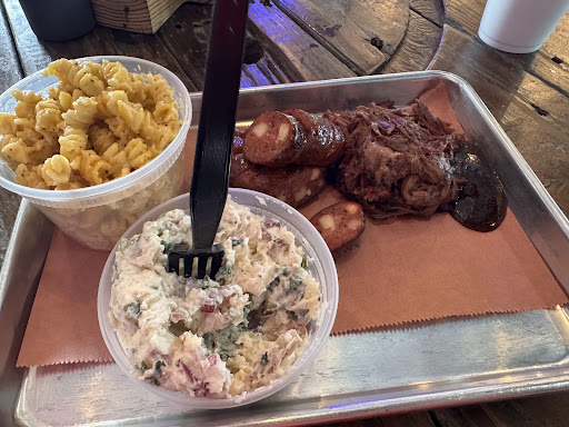 I ordered food from the blue trailer that was near the new restaurant. I only had to wait behind a couple before it was my turn. The man that took my order was also the meat cutter. He was a little gruff when I was ordering. At that time they were out of regular pork ribs. They did have specialty ribs: garlic Parmesan pork ribs. I ended up getting a pound of brisket, turkey, and garlic Parmesan ribs. I also ordered 1/2 lb of each sausage: jalapeño cheddar and beef. For sides, I got a pint of brisket beans, Cole slaw, potato salad, and smoked Mac and cheese. My order also came with pickles and onions. No bread was offered or given. My total was +$90 with no tip.