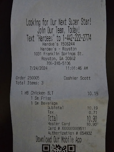 Ā Ā Ā Read moreI've never given a poor review before but since Hardee's home office customer service voicemail is full and no messages can be given, I'll share my experience with everyone. I'll get to the point now. I went inside the Hardee's in Royston GA to place my order. An employee was taking inventory of items in the area where the drink dispensers are in the drive thru. He had pulled out a box of large tea bags to count them. He took all the bare tea bags, they were not sealed in any outer bag, and put them one the floor to count them as he put them back in the box. I've said enough about this situation. It's not poor training from Hardee's but it's poor training from this guys home life. This occurred on 6/14/21 at around 8:20 pm. The other boxes of items were emptied onto the floor and counted the same way. He didn't mind us watching him do it. Yes, I should have said something to him. In these days of being politically correct and confronting people who may potentially get their feelings hurt, I chose not to. It's not my hometown, I was just passing through. My advice to Hardee's home office is to check their messages so others an leave one. Dine from there at your own risk. There's no telling what else these...