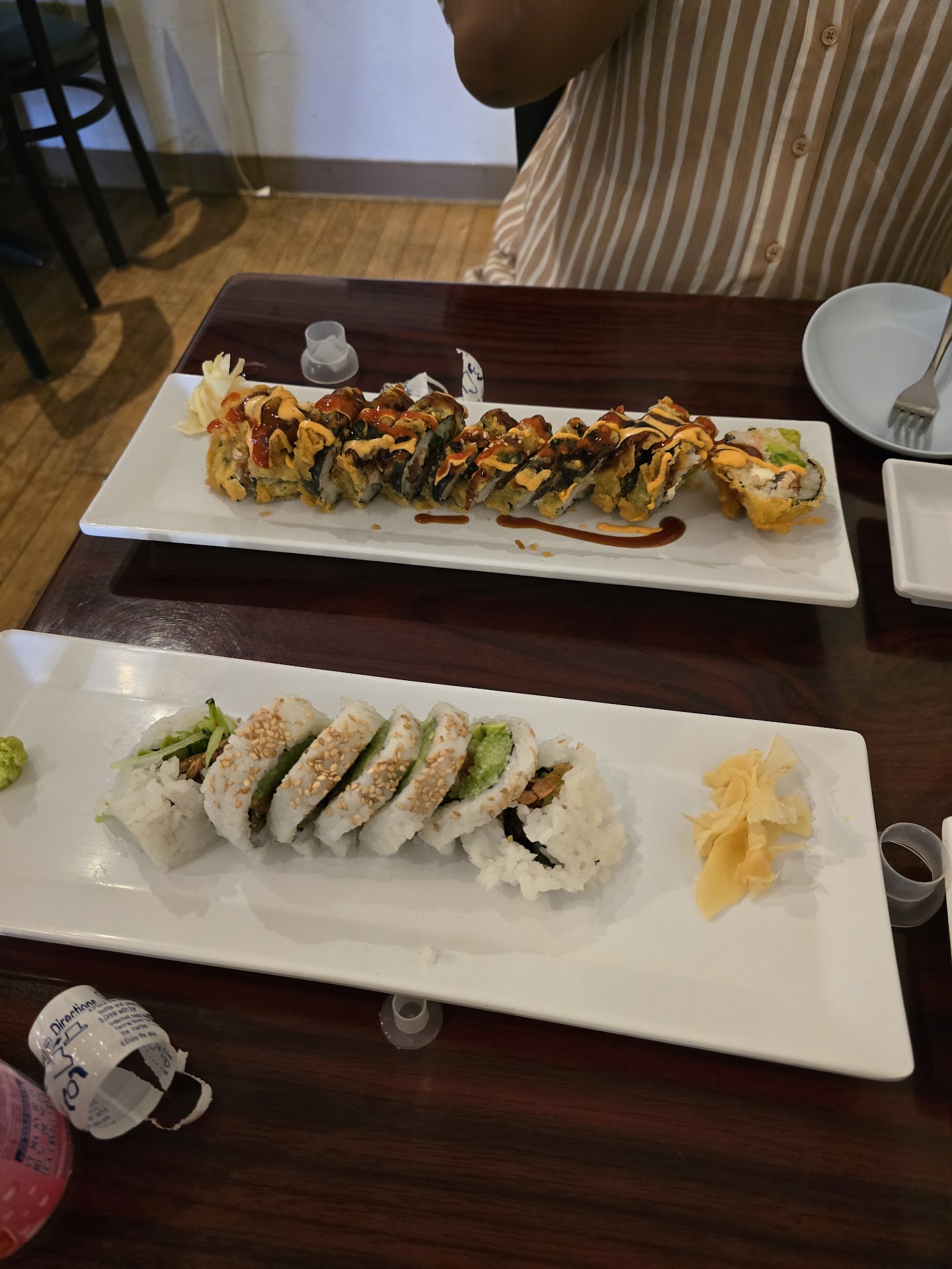 We had the spring rolls with tofu and 3 sushi rolls. They were all fabulous. The best, in my opinion, was the Kitsune Roll. Its vegetarian, which I'm not by a long shot, and features sweet potato. Which I have never had in a sushi roll before. It was fabulous, I highly recommend it. The others were a spicy tuna roll and a shrimp tempura roll. Both had great flavor, tasted fresh and were well wrapped.