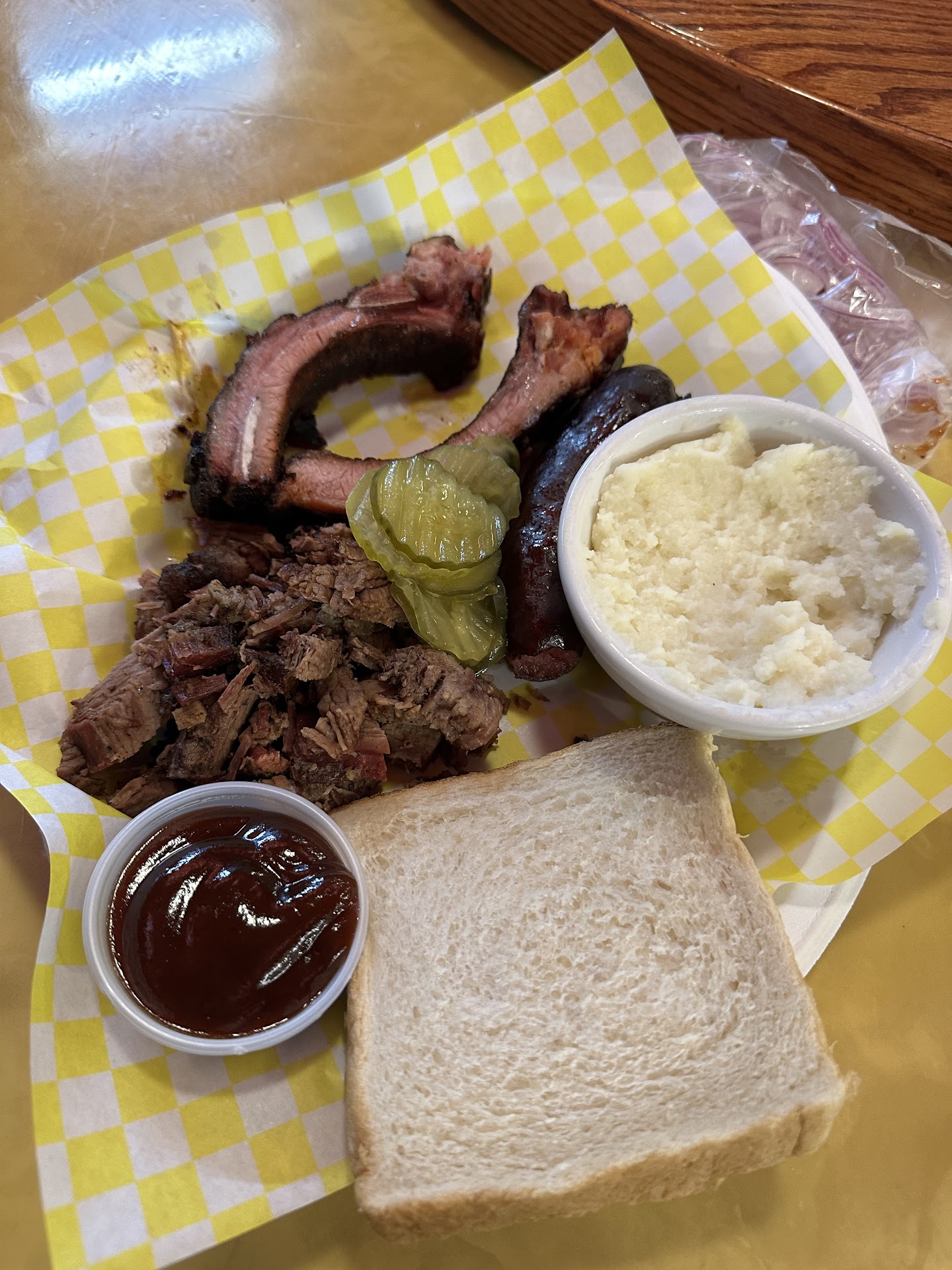 Stopped in for lunch today. The lunch menu was somewhat limited. They had fried chicken and brisket available. I went with the two piece with one side - $7. I added a couple of pieces of sliced brisket and my side was the mashed potatoes. I think the fried chicken would have been better if it had been fresh. The mashed potatoes were bland and the white gravy was watery. The brisket was not bad except that it was microwaved to warm it up which dried it out. The chicken was probably microwaved too. I only say this because it came out so quickly, not enough time to fry it. Maybe some of their other food is better, but I wasn't impressed...