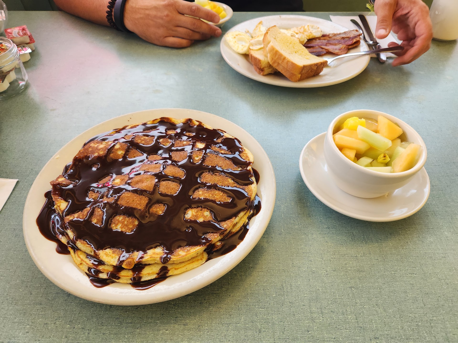 But I really expected berries to come included with the Pancakes or the French toast breakfasts, not as an extra, and not cantaloup and pineapple. Just plain Pancakes or French toast is pretty bland. You need berries with those. Cantaloupe and Pineapple a weird choice of fruit selection you offer. But hey, I was willing to try it. Maybe I'm just a "Mr.Fancy Pants" and should have stuck with ordering a regular "Eggs and Side" breakfast.