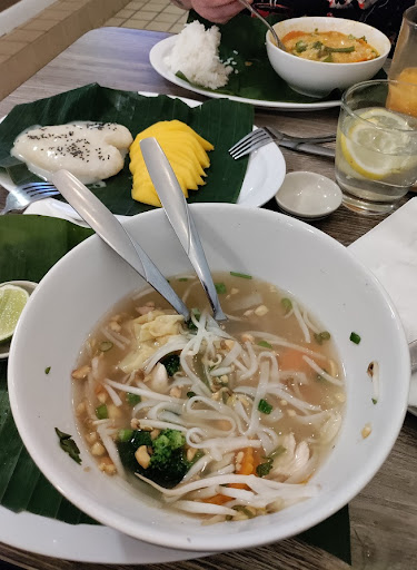 The following items were sampled: Thai tulip dumplings, chicken curry puff, mung bean curry puff, coconut soup, clear broth noodle soup with chicken, vegetable penang curry dish, and mango sticky rice. The beverages were Thai tea and Thai coffee. Absolutely everything was delicious and felt unique in my mouth.