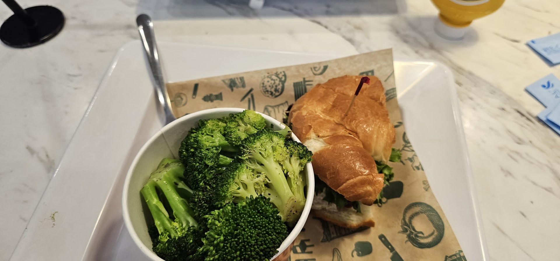 We both ordered a bowl of soup, half a chicken club sandwich, and iced tea. The big cup of tea was the highlight. As for the soup and sandwich it was about average. The half sandwich itself was not a deli roll type sandwich but was more made out of slices of bread. The amount of soup totaled maybe a little over a cup. For that we paid $22 and some change. It was hardly worth it. However the soup was good (broccoli-cheddar). I just wish they wouldn't have been so stingy with...