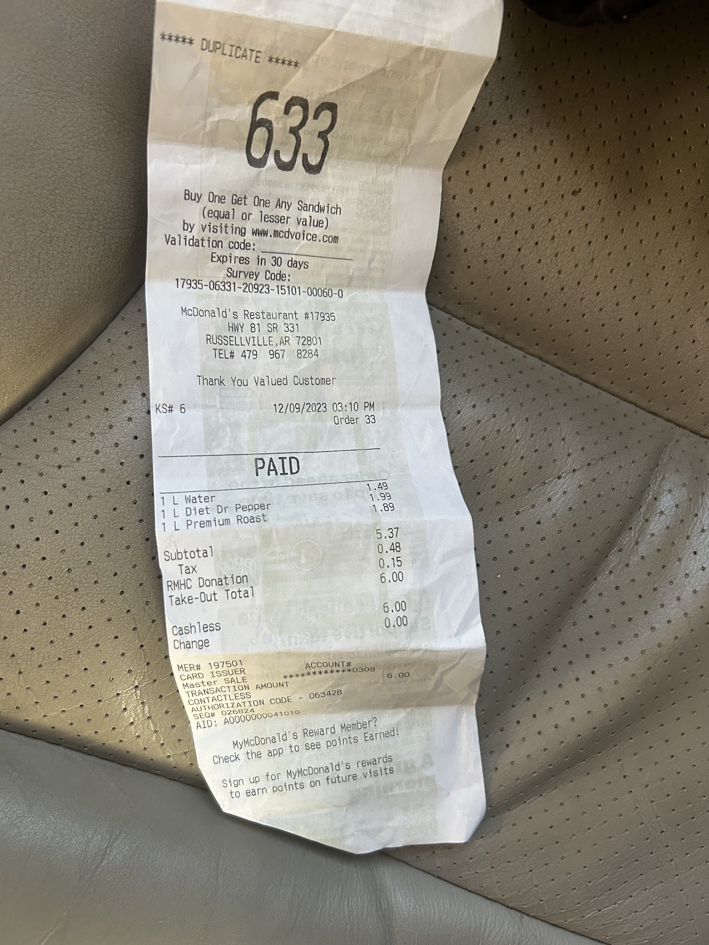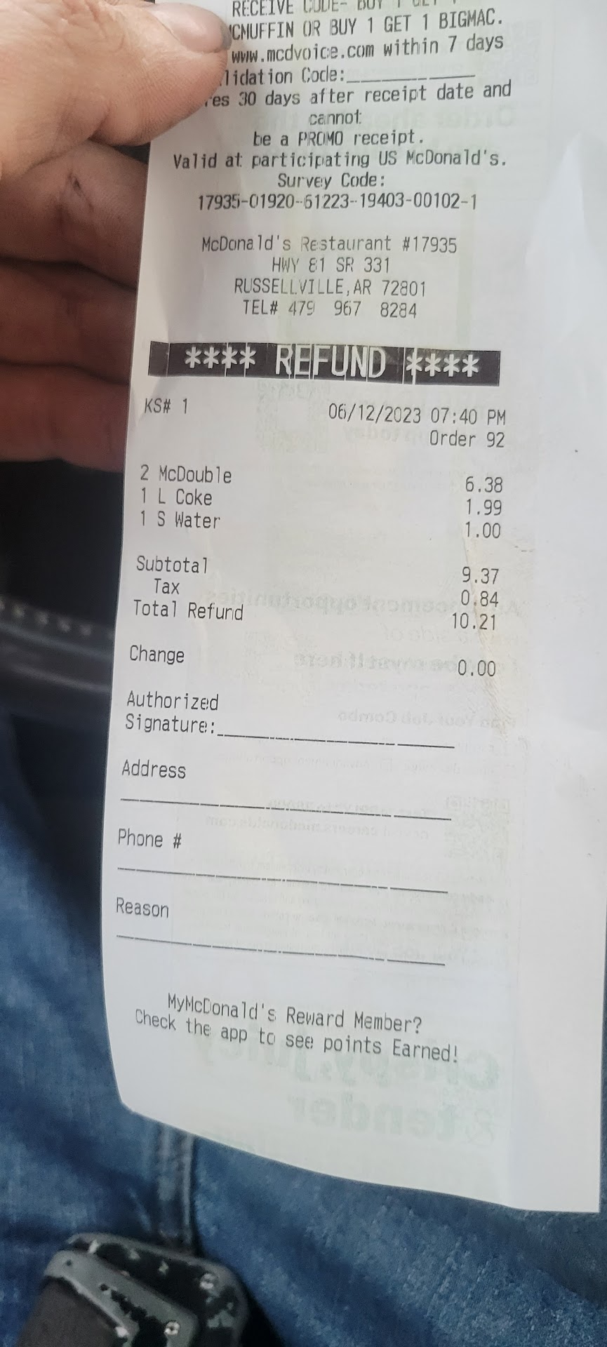 Read moreThe McDonald's on ar331 in Russellville, AR is the worst McDonald's I believe I have ever been in. The drive thru is 2 lanes, and both lanes were backed up to the main road. I decided to park and walk in to order my lunch, a number 7 = 2 cheeseburgers, medium fries, and a coke. Probably the easiest meal they make, after 35 minutes of standing there in the lobby, the young kid that was wearing a assistant manager badge walked by me without any contact, I decided to get his attention and show him my receipt, he said he doesn't have time to help me, he has to go on the roof. I said hold on, I'm the customer, I showed him my receipt with the time of order, and said this is unacceptable, he went in the back for all of a quick minute, and came back with my meal, didn't apologize or anything, I said said thank you and walked out, after I get back to my truck, I checked the meal and it wasn't hot, it may have been just over room temperature. Absolutely disappointed. I left and just disposed of the food. And they want 15.00 dollars or more an hour for there wage, ... Hell no, they can't even get a simple order right or on time. I will not return to this address. I will drive across town to a different...