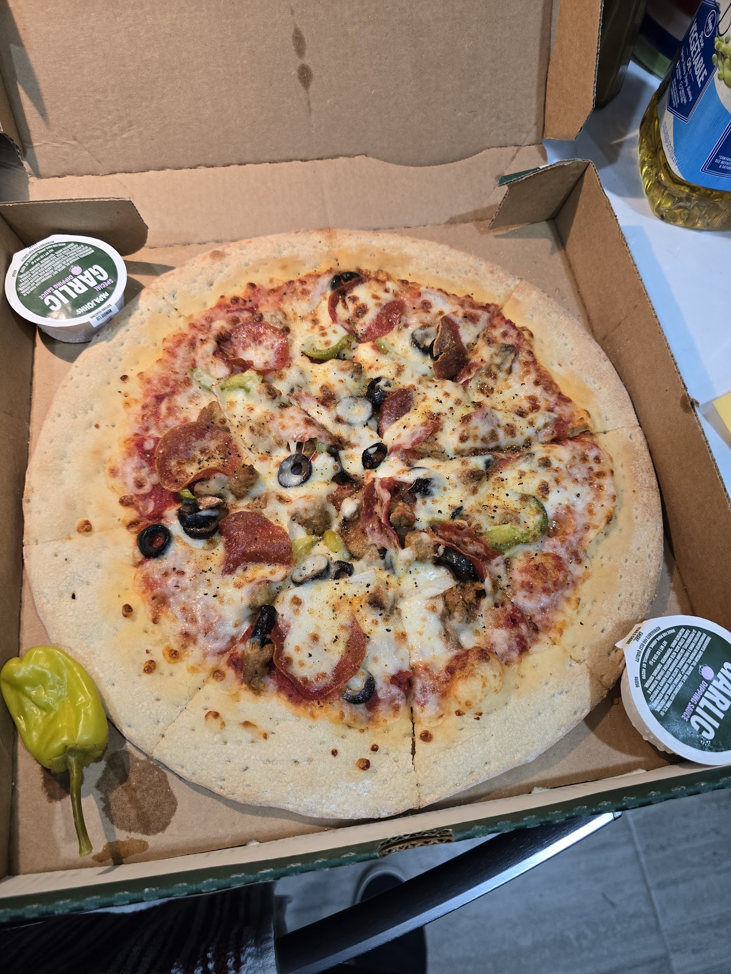 Read moreOkay, so I don't normally have a problem with papa John's, but today I did. The delivery guy was very nice. I want to put that out there. It was the food. Firstly, my mom ordered the 10 piece unsauced wings. She got to eat 5 of them, but then she bit into one that was RAW! Gross. Second, I had a new York style pepperoni pizza, well done. I had three slices before it turned cold. I also found a hair cooked into the pepperoni on the slice I was about to eat. Very disappointing. Lastly, I ordered extra of the peppers they give u with your pizza. I only got one, that comes with the pizza, but when I ordered 3 extra last time, they gave me 20 so not sure on how they distinguish how many peppers to give. Like I said, usually they are good, but...