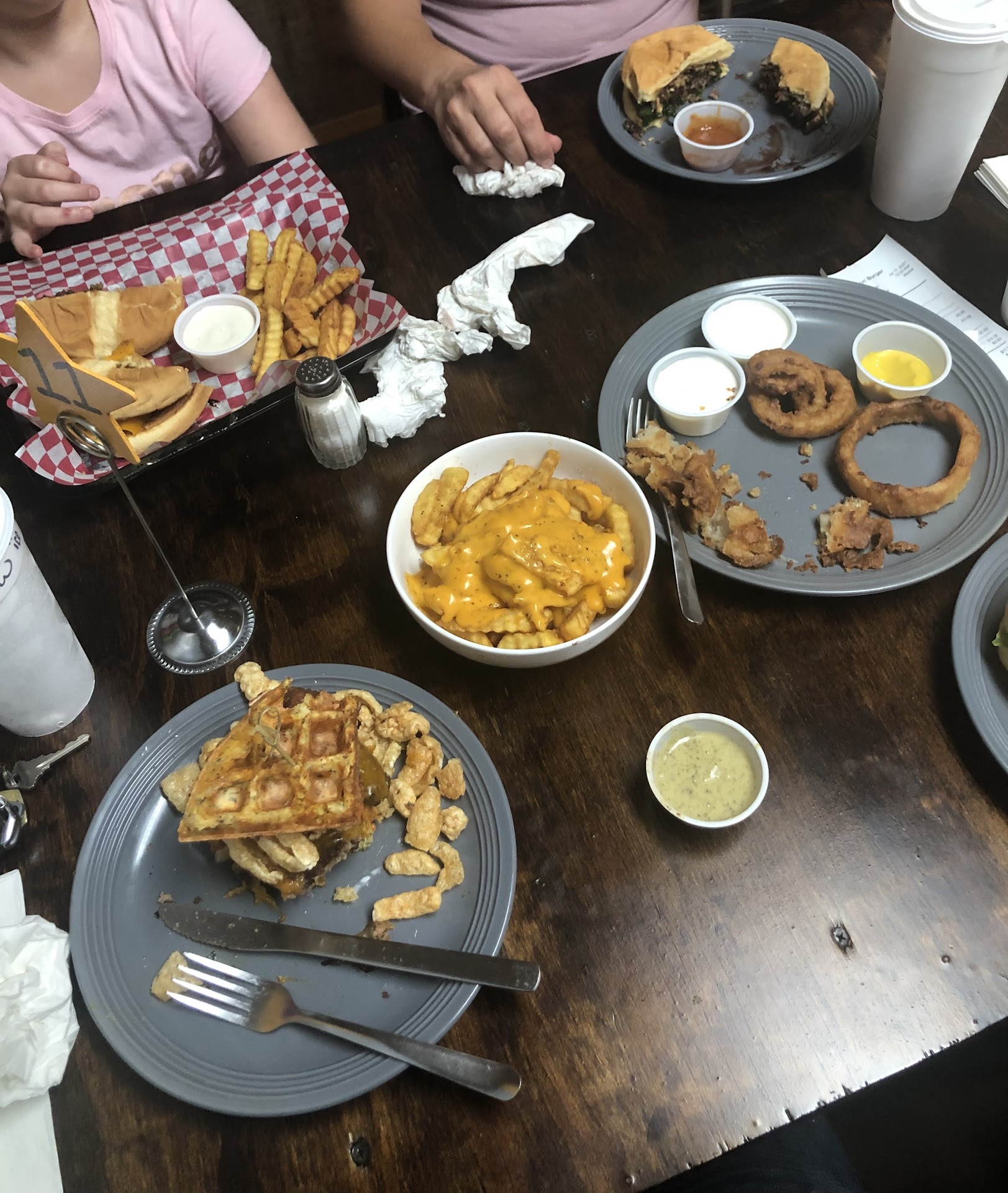 Mixed emotions on how to rate this: torn between 4 or 5 stars. The place is in an older house and is clean and well decorated. The room with the jail cell doors is cute and quirky! They take cash or card and you order and pay before you are seated. The burger choices are on wanted signs hanging on the wall, and most rum about $10-12 for the burger with a side. We both had seasoned fries: crinkle cut fries cooked perfectly with seasoning salt on them. My husband had the mushroom burger amd loved it. I had the Marshall, which is 2 patties, 2 cheeses, bacon and a scoop of pulled pork bbq. Food took a little bit to come out, but we didn't mind the wait because the staff are very friendly and everything came out hot and fresh and the burgers are real patties--they didnt seem to be frozen or pre-made. They even use real (glass) plates, bowls and metal silverware and you are seated at a table, not a booth. They have the best prices on drinks: $1.25 for a 20 ounce Styrofoam that you can get refills on (Pepsi products). Here is where my confusion on my review lies. We spent $28 on food for 2 (competitive prices), and everything tasted amazing. But, we both left hungry. The mushroom burger is a small burger! So, we will be back, and we loved the flavor, but I don't think this is the place if you are "big" hungry (unless you order...