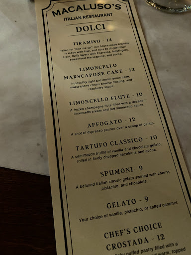 Unfortunately, we had no room for dessert, and there were highly tempting choices. Next time... And there will be many next times. Macaluso's is now one of our two favorite Italian restaurants. It's a great choice for special events or just for a nice evening out. I don't know if reservations are required for lunch or for dinner during the week. But play it safe...