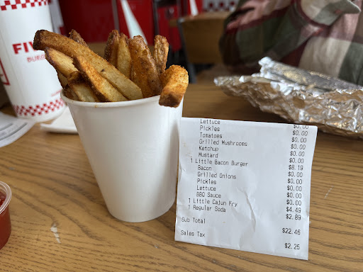 Read moreOk 5 Guys what's up with little to NO fries??? I have been to many 5 Guys all over the USA but this one has disappointed me. Sorry. My wife and I use to get the medium Cajun fries but as we've gotten older we have downsized to the "Little" size. There is usually a good cupful plus several extra so we can share them but today..... what the heck??? Only a cupful and NO more!? I could have gone to the grocery store and bought 5lb's of potatoes for the same price you charged and all we get is a dinky cupful!! Now I'm not one to complain but if you're going to skimp on the servings then I'll be looking to eat elsewhere, there's a Panera Bread just down the street that we could have gone to but did not, maybe I'll rethink that in the future. We are only here today, as we travel in our RV and move around alot, and will not be back in the area anytime soon. I just wanted others to be aware of what is happening. FYI.... the burger, as always, was GREAT! We have never been disappointed in that department but today was a bit saddening to only get a cupful of fries. Good luck in this location and maybe see you if we travel this way...