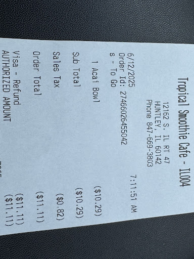 Ā Ā Ā Read moreI usually enjoy ordering the AƧaĆ Bowl from Tropical Smoothie CafĆ©, especially when I visit the Vernon Hills location. Itās always served properly ā with Greek yogurt and fresh ingredients, never frozen. However, my experience at the Huntley location has been disappointing.