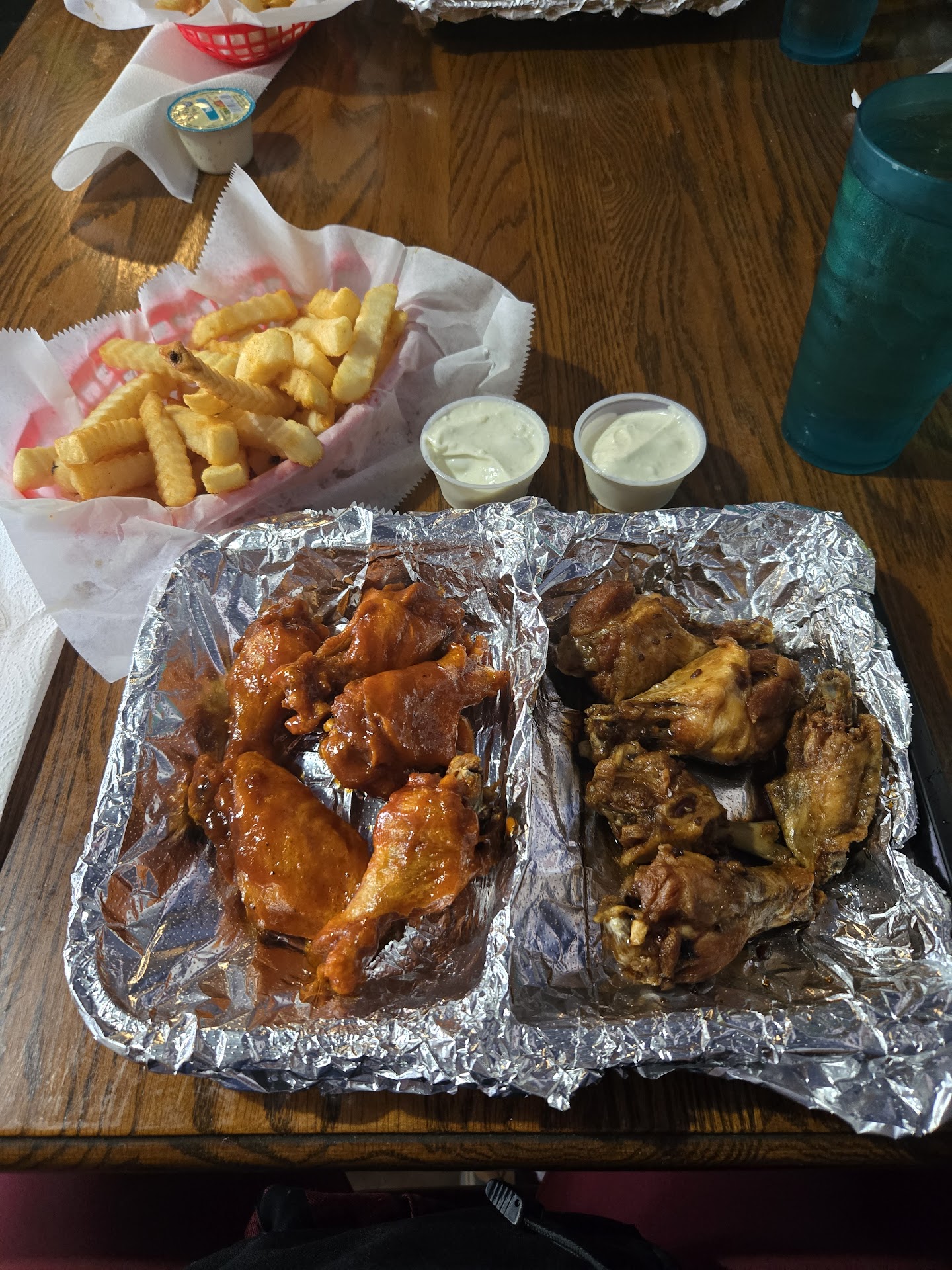 The wings were amazing!! The young lady who took our order was really sweet & polite. She left before we got our food & the long blond lady who came in after her is the reason I left a 3 star rating! She seemed annoyed to be there, rolled her eyes when a group of 4 customers walked in & then yelled âWEâRE SELF SERVE!!â Not everyone knows what that means! We were missing part of our order, she got annoyed I had to interrupt her to get it. When we went up to the bar to get a refill on our drinks(bc they were self serve & not waitressing, even tho the other nice lady brought out other ppls food) she rolled her eyes again bc we asked for ice on our tea. If youâre going to work customer service, you put a smile on your face & make ppl feel welcomed when eating at the establishment. We drove over an hour bc ppl raved over the wings there, it was our first & last...