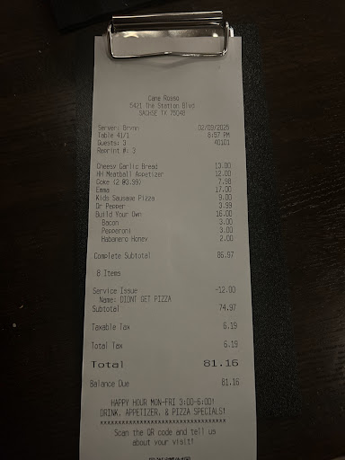 So for starters the pizza is amazing no doubt about it and We live down the street and were excited to try this place and unfortunately I was left disappointed. We came in Super Bowl Sunday around 740pm it was empty which was a good thing because when I called the day before the wait time was 2hrs so we were hopeful to be seated and get our food quickly and go home, sadly it was far from that. We sat down and the waitress was friendly and polite and explained the menu/pizzas since it was our first time mind you it’s empty in there and the menu says pizzas cooked in about 90 seconds or less which I thought it wouldn’t be a long wait we ordered an appetizer it came out fairly quickly and then waited and waited for the pizza it took about 45 min for our pizzas and the restaurant was empty. I don’t know who’s in the kitchen or what happened The waitress came and said that per the kitchen our food was brought out but it was not and so she went to tell them again they would need to remake our food. After already waiting 45’min in an almost empty restaurant I don’t know where the pizza that was ours went but it didn’t come to our table. we were told it would be another 10-15min to get our food. Im obviously annoyed and super hungry at this point and was told we could get an another app for free on the house for the wait and they could put it to go because they were about to close. That’s how long we waited on our food they were almost closing. We said sure go ahead and do that but then we changed our minds and said if we could just get a discount off the pizzas instead that have now have taken almost an hr to come to our table over the app she insisted that she would try but that her assistant general manager wouldn’t budge on the discount we said ok that’s fine I guess and didn’t argue with her because she tried and was trying to be helpful she brought me the receipt $81 for 3 of us. I always write reviews to show my experience and once someone noted I’m sure of it that I was taking photos of the empty restaurant and my food the waitress came back immediately with her assistant manager who tried to brush it off saying they ended up giving me the discount and that he apologized for the delay as they’re working through the kinks of a new restaurant and I get that but I truly feel that they only decided to help make it right after they noted I’m a reviewer and was taking photos of my food and restaurant. Why didn’t he just do it when the waitress told him from the beginning after waiting an hr for food. It’s a shame that the food was actually really good and I enjoyed the Neapolitan style pizza but to wait there for over an hr and then have the kitchen say they did bring our food out when they didn’t and then being almost forced to rush to eat because they were closing was not a good experience. I think time management needs work from the kitchen staff and pro active responses from management why wait to get it taken care of last minute if there’s an issue from the beginning be pro active and try to resolve it from the start and make it right at the end of the day there is no business without paying customers they should be taken care of especially if you just opened up. I attached photos of the empty restaurant and the receipt of the discount he...