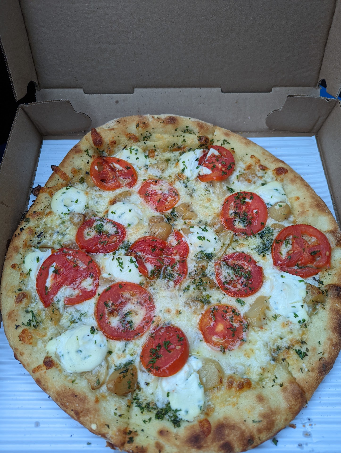 Ā Ā Ā Read moreThe pizza was incredible, as you can see from the picture. I ordered the 4 cheese and added tomato as well as extra roasted garlic. The roasted garlic was my favorite. I arrived just after it was ready(which is a very good thing because there is no warming system. Your finished pizza just gets stacked on an open wire shelf with the rest of them). I also ordered and received 3 sides of ranch that were on top of the box when it was handed to me. Nothing was said. It was only when I got to the car, placed the pizza on the front seat(which has a slight tilt) and watched the dressings slide off that I realized the covers were far too large and were just sitting on top of the containers. Ranch dressing everywhere, through every microscopic hole in the vented seats. I understand that mistakes happen(ordering the wrong size cover). But, warn your customers! Better yet, put tape over the top of the lid! At nearly $25 for one small pizza plus tip, I expect that level of service. What happened to me was completely avoidable, ruined my dinner(I did eat that beautiful pizza, but when it was cold because of all the cleanup) and will cost me a detailing because I do not have the necessary tools to get the remaining residue out.