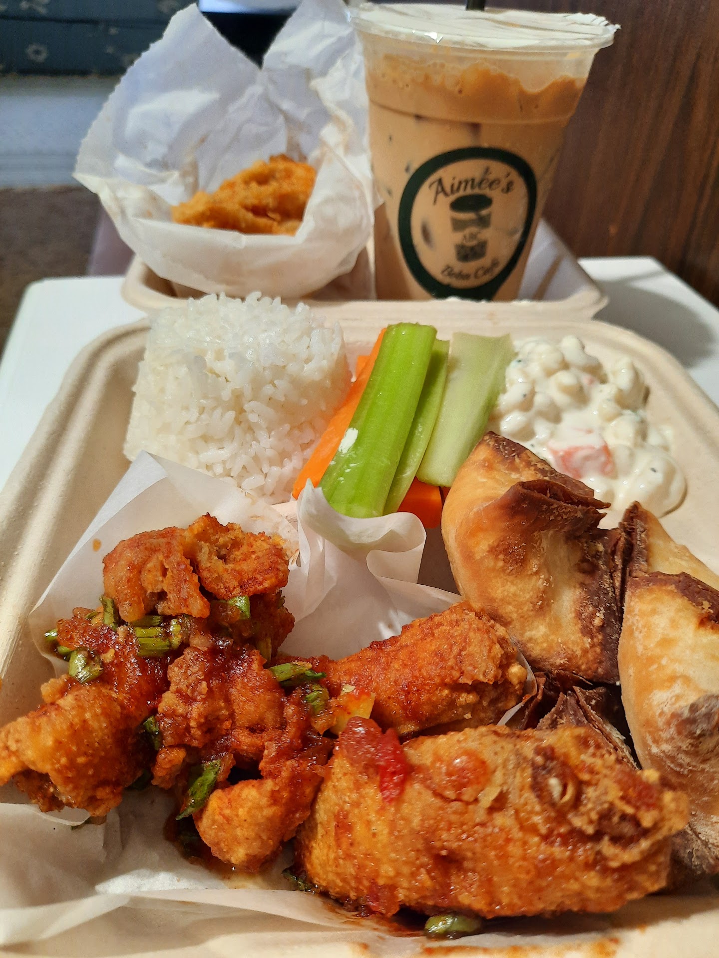 Read moreWhat a great spot! I'm so glad I tried it. I ordered through Doordash. Very happy. The chicken was perfectly set to my chosen spicy level. I only wish the calamari was a bit crispier on the outside, but that's just travel times, ya know? It was nice and perfectly tender. I loved the Hazelnut coffee. Nice and strong, perfectly sweetened and not over sweet. The mac salad was just alright, a bit too overdressed. Will definitely order more things to try again.