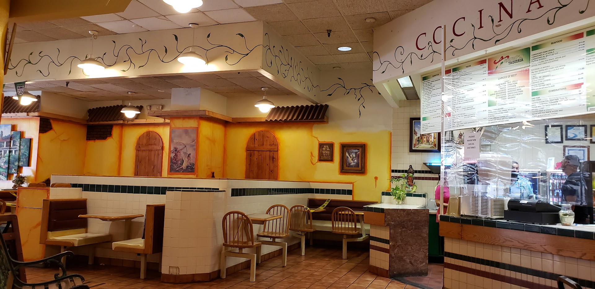 Simple setting for classic Mexican street eats including breakfast burritos, served at a counter.