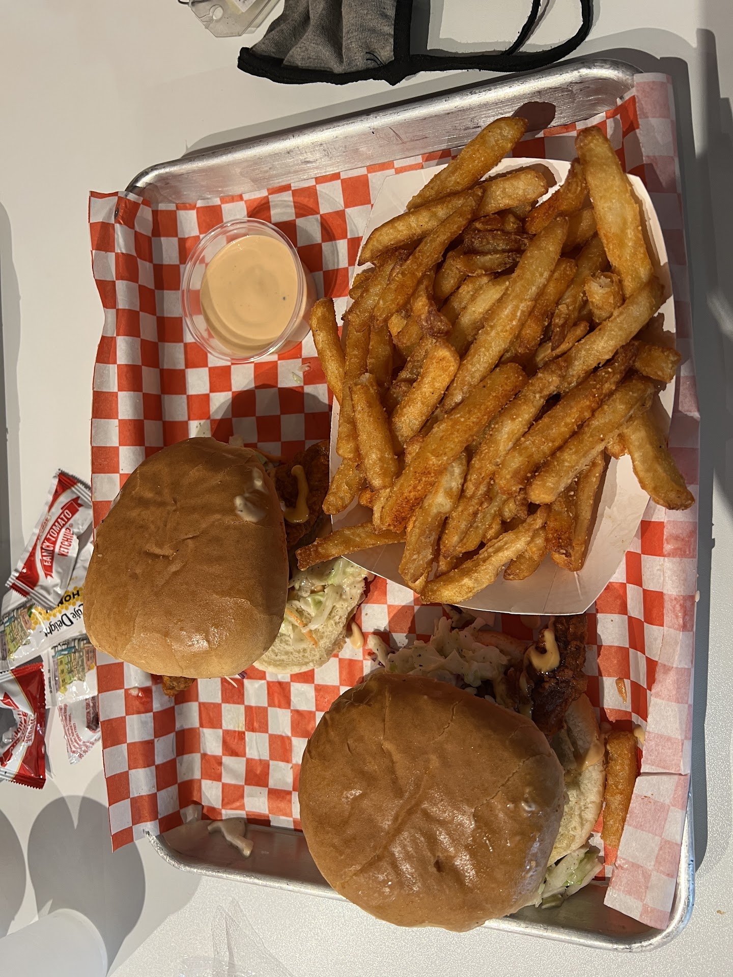 Place isn't too bad. Staff is good. Portions feel good for the price. Lots of fries and easy access to get their sauce. My only problems were sogginess and abnormally high spice level. The chicken isn't crispy, the bun got soggy, and the fries were slightly soggy.
