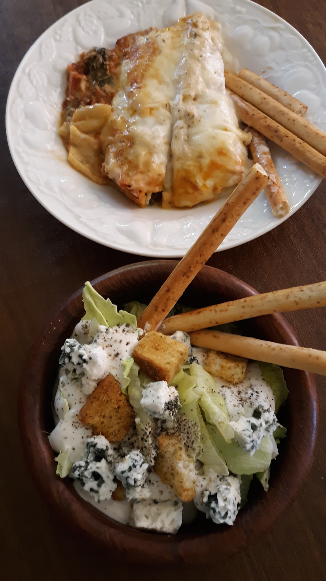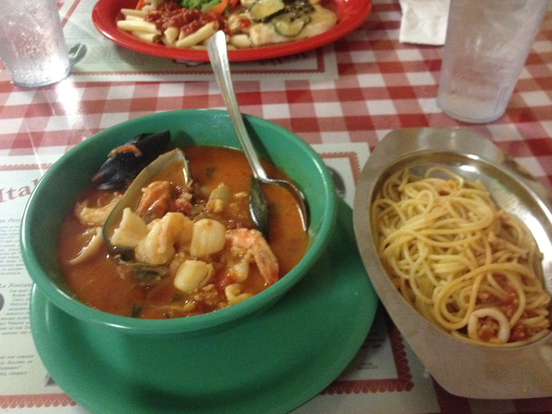 the food wasn't even that great and i only had a few bites of the salad which was too strong and the pasta had no taste, bland.