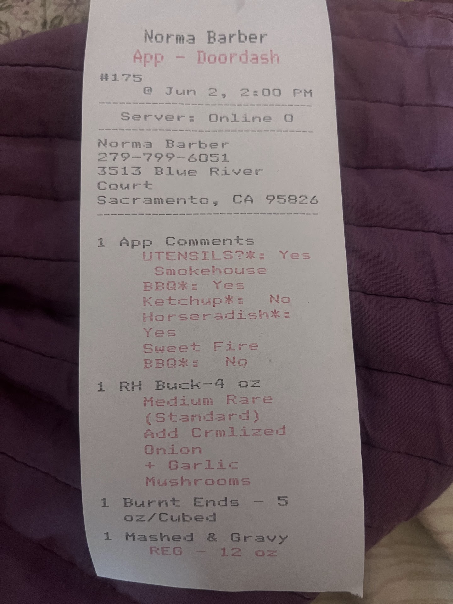 Read moreExcuse my language but I am bleeping MAD! Just when I have faith in a restaurant again they take 5 steps back. The last time I ordered the tri tip sandwich it was so good. The only issue was the bread was a little burnt. I was craving the sandwich again and ordered the Roadhouse Buck Tri Tip Sandwich and added garlic mushrooms and caramelized onions to make it "pop" and add some delish but I don't see the onions and the mushrooms are sparse. What happened to receiving your food and it being visually stunning where you just dive in and after those first few bites you smile because it's amazing! Yeah that didn't happen. Don't get me wrong the sandwich is good but no caramelized onions and I had to spread the 4 mushrooms I got so I could taste a little with each bite. I like when a cook enjoys making food and prepares it with pride and some heart as if they're cooking for family. This meal seemed thrown together and no one looked at the ticket apparently because you can see I added the caramelized onions, mushroom, I requested horseradish, smokehouse bbq sauce and utensils and I did not get any of them. It was my Buck'n anniversary for signing up for the rewards so my reward was free burnt ends. I received them but the au jus container was sealed inside the container so the top was sharped and the su jus barely covered the bottom of the container, maybe a tablespoon was in there give or take. I ordered a side of garlic mashed potatoes and those were good, they didn't mess up on that. My last order was handled with care because I got all the extras I ordered and the au jus they gave me was delicious I even added some to my mashed potatoes. This time was such a disappointment. It goes to show no one did a quality control check to match items with what's on the ticket before letting it leave...