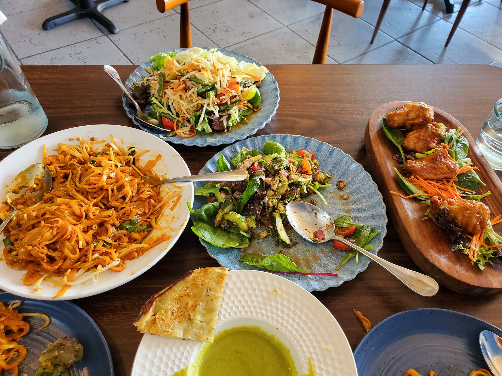 Everything was on point! Nothing negative. The fried rice was one of my favorites. Very tasty. Loved it with the yellow curry over it. The yellow curry was coconut milky goodness. No spice, which we looked for the kids. I'm sure you can order to the spice you like. The stir fried veggies came in a delicious sauce that went incredibly well over white rice. The pad thai noodles was okay. Not negative, but okay. The peanut sauce did the spring rolls was delicious.