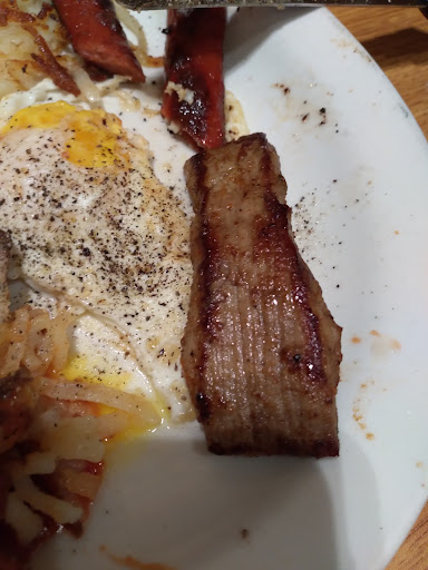 Got Meat Lover Sampler. (Came with a waffle, two eggs, hash browns, two strips of bacon (beef, not pork), a chicken patty, and a seasoned “steak strip.” Waffle thin. Not crisp. Dry, really. Actual flavor okay. Reminiscent of what I would think a pumpkin spice flavor should be, more subtle than overpowering. But the texture spoke of the dreary thing too often encountered, like it was baked. Look, I’m not a food snob. Okay, that’s a lie in many ways. Still, if the name of the establishment includes “waffle,” the waffle needs to be at least good, if not really good. And good waffles aren’t baked in a civilized fashion. A good waffle means treating the batter, which should be thinner rather than thicker, with violence akin to criminal assault. That intricate waffle iron should be very very hot, and the batter has to include sufficient oil that it the waffle cooks by frying from the outside in, so the outside is crisp from searing abuse, while the inside is searingly steamed. The violent heat inside should be proven by some batter expanding to the point of spilling out, unless the measurement was scientific. This wasn’t a good waffle. And the butter was cold. Why is butter ever, ever served cold when it should melt atop a hot waffle? Plus the waffle wasn’t hot. (Of course the syrup was table syrup, not maple, but I’ve had much worse table syrup.) Scott asked, and I specified scrambled for the two eggs. They were fine. Notably more dry than I like, but nothing upsetting. I know some customers don’t like eggs moist at all. They were unsalted, but that’s why the salt shaker was provided. I finished the eggs. The hash browns weren’t bad at all. The outside had a nice crisp and browning, while the inside was fully cooked (although it was a close thing). Oily, sure, but hash browns aren't diet food. I finished them. I’ve never had beef bacon. It was fine. Clearly oven-cooked, but I’m good with that. Thinner than the thick-cut pork bacon that I like to oven-cook, but maybe thin is necessary with beef. Tasty enough. There was a ground bird patty. I wondered if it was turkey, but ruled that out in favor of a verdict that it was ground chicken. The seasoning wasn’t bad, but it was dry like ground chicken almost always is unless one adds some fat. I mostly left it on the plate. The “steak” strip. Um, the server didn’t ask how I wanted it cooked, and it didn’t occur to me to ask. What I got was well done. Which is not really a job well done, when steak is at issue. A nibble or too was too much, even though again the seasoning didn’t seem to be a problem. I also ordered the Grits and Shrimp, which includes cornbread The Grits The grits came in a stylized pan, with six shrimp in them, the grits dotted with bits of small diced grilled onions, small diced green peppers, and shreds of melted cheese that I’ll describe as “yellow” because I couldn’t be sure what it was. But make no mistake, I finished pretty much all of it. I ate all the shrimp. They were good-sized, not those tiny things you sometimes see. They were seasoned nicely too. They were cooked better than expected. Four of them were cooked pretty much perfectly, not overcooked. The fifth, well, if overcooked at all it was so slightly as to be worth only noting, not complaining about. And the sixth, while certainly overcooked to the point that I have to note it, it still wasn’t to the point that I hesitated to eat it. The grits were fine. Somewhere between hot and warm, no lumps, and I suppose creamy is fair to say but I think I like grits a little thicker. I don’t know exactly what the veggies added, but certainly something--I’m pretty sure the grits were better with them than without. I ate well over half the grits. With the grits came cornbread. It seemed to have been baked in a loaf pan, then sliced like pound cake, and the two slices had been toasted a bit. Faintly sweet. Not too dry. And anyway it beat the...