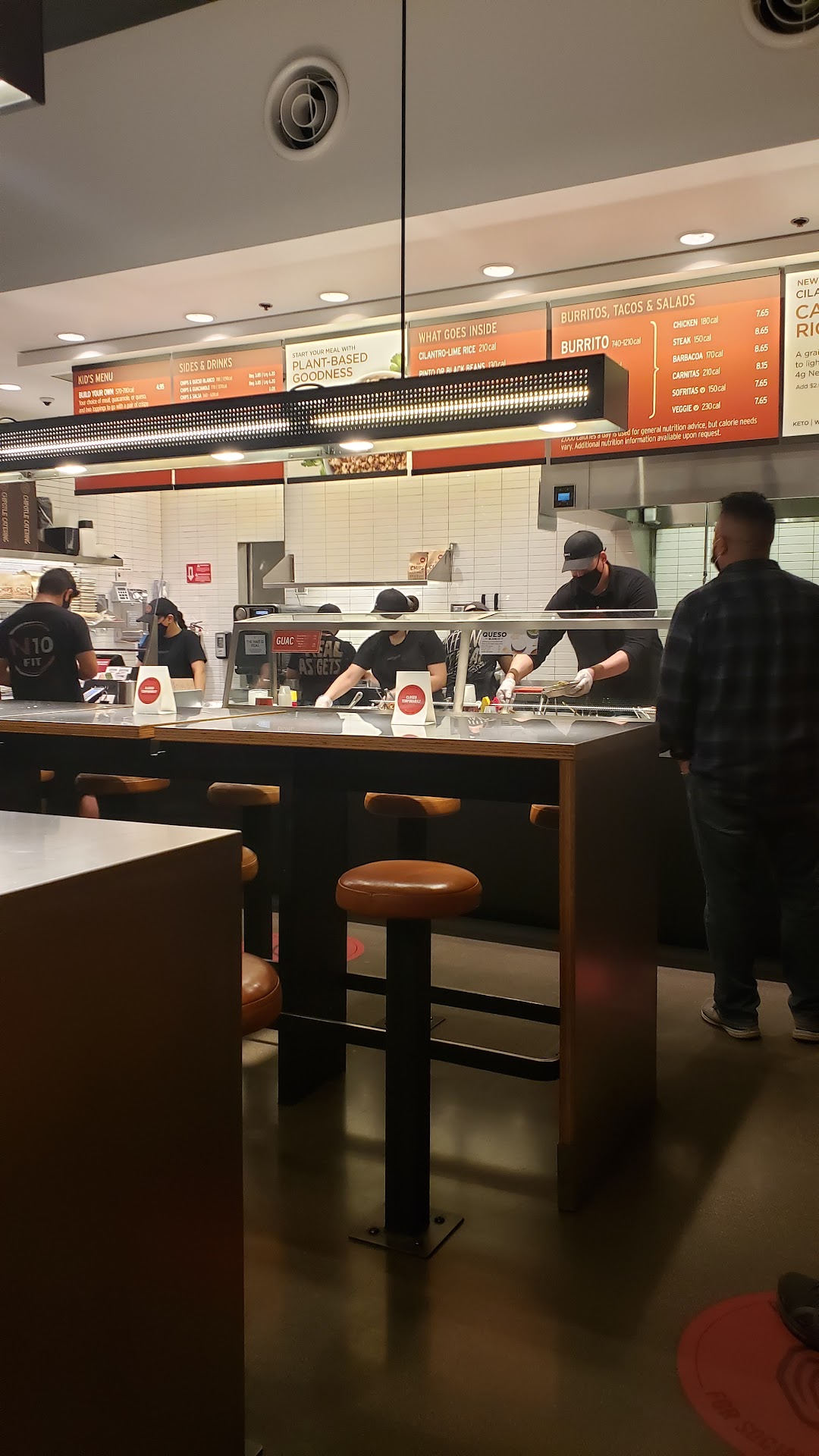Read moreThe food is always fresh and pretty good,no complaints in that department, and the restaurant is always clean a big plus. Masks are required and hand sanitizer is provided upon entering. This Chipotle is on my way home from work so occasionally I stop by here and get a quick bite for dinner, most times it's past 8pm. On Friday there is usually a long line(not a big surprise it is Friday night), but on the other days during the week there might be 1-3 people in line to order. The outside is open for dinning only. I take one star away for the customer service . On 3 different occasions I've been there, and only having 1-3 customer's in line the wait has been a little longer than average. I'm by no means an impatient person, I've worked in this line of work before, so I understand how it is after you been on your feet all day ,busy,and tired. This particular day (Monday night)The employees were working, cleaning etc. And only having 2 people in line took over 20 min. I understand the cleaning, restocking, and conversation is important, but so are the customers. If it was me I'd focus on getting the customers in and out, even more so,when there is only 2 customers waiting in line.When there are about 5 employees working it shouldn't take that long. I hate to sound picky but its happened more than once. I'm tired as well I'd like to get my order and get home, sometimes I just consider going across the street to Mc Donald's or Taco bell instead. When I'm tired I'd rather sit in my car and go to the drive thru, then have to park, get out and wait. Especially when there isn't many...