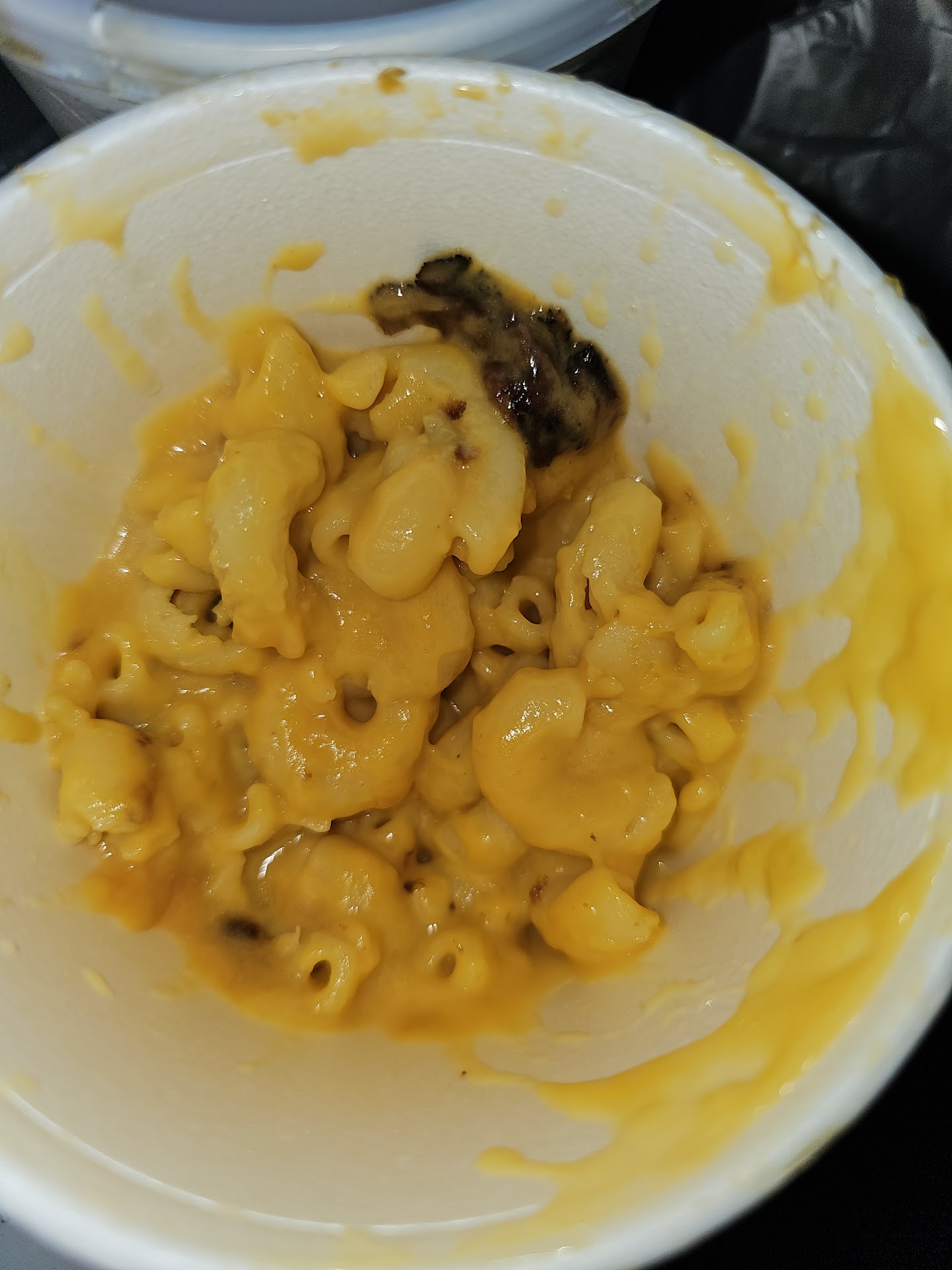 I got home to find that not only were the stuffed jalapenos a joke, but I got some pieces of chicken nuggets instead of the 16 jalapenos (again that weren't even as good as the type I buy at the grocery store), but the large mac'n'chesse was only 2/3rds full and looked like it was scrapped out of the pan as it was brunt on some and dry. The small coleslaw was also short (about half full) and lacked any sense of of even being coleslaw. It was basically shredded cabbage and carrots that I had to doctor up.