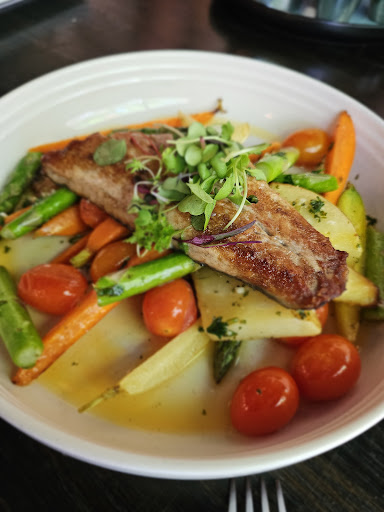 For mains, we shared a juicy burger with crispy fries, a crunchy chicken sandwich, and a perfectly cooked sea bass over colorful veggies. Everything was delicious and way above our expectations.