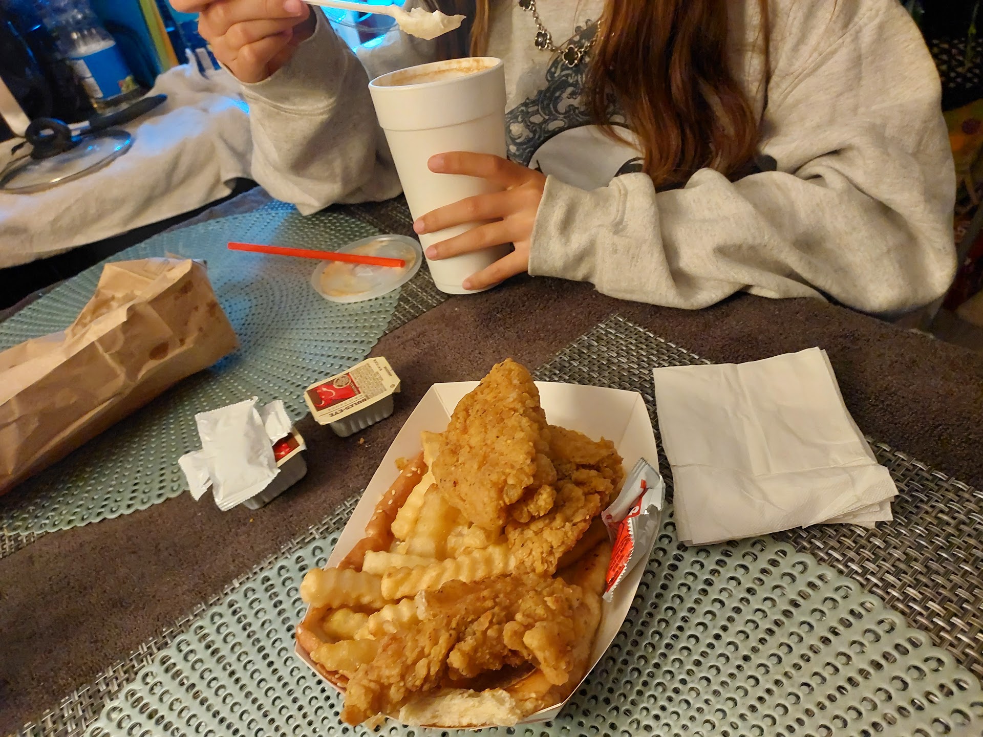 Read moreI ordered chicken strips and a large root beer float today. The root beer float was 2 small sips of rootbeer and an entire cup of ice cream. The chicken was flaccid, limp, flavorless, and of the poorest quality (Comparable to jail food). The fries were pre-frozen crinkle cut fries, that we didn't even get a handful of. Instead, the merchant attempted to make the tray look fuller by adding 2 pieces of bread at the bottom. Very creative 🤔