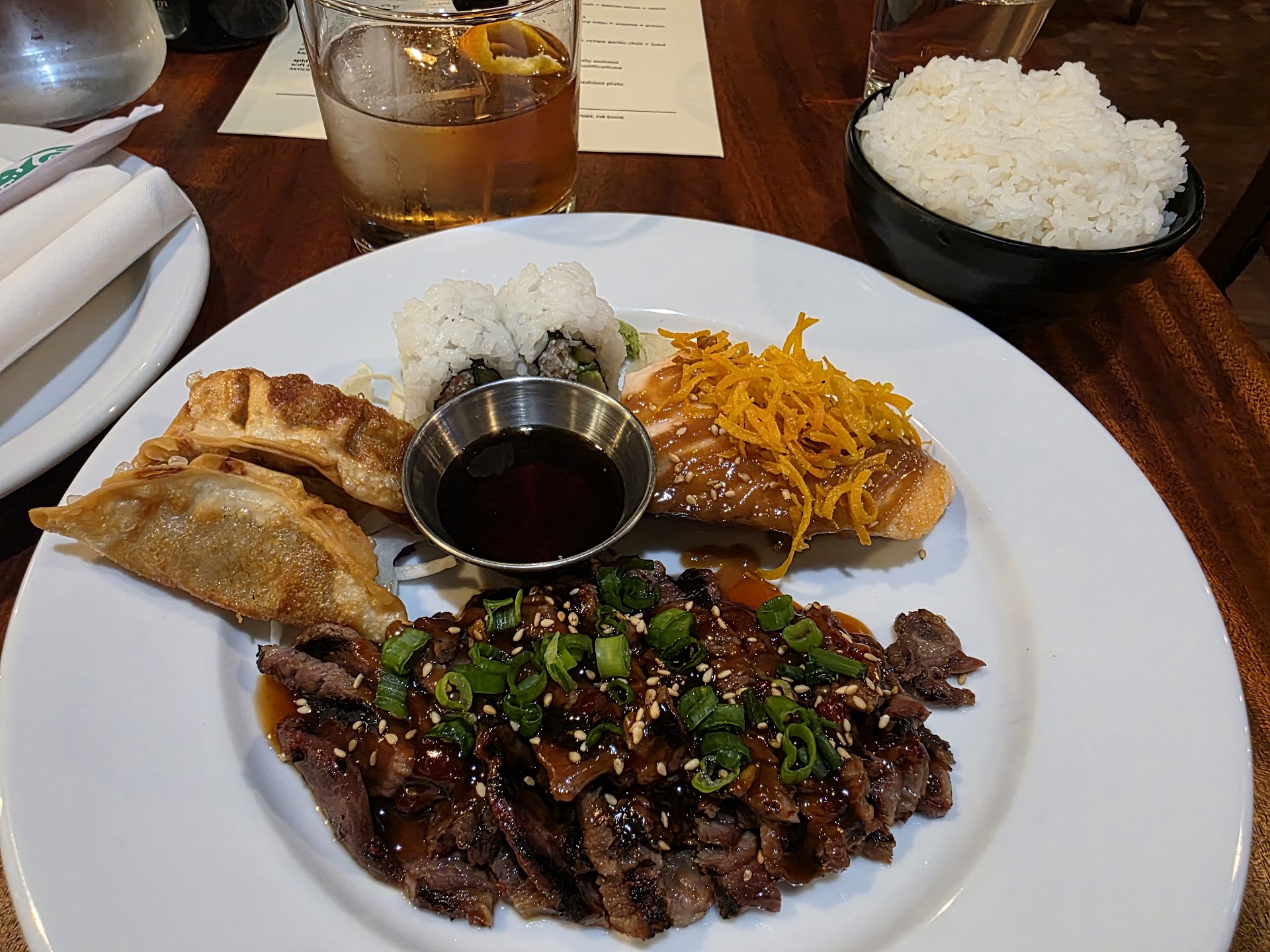 Their lunch special is an absolute steal at $15! It includes your choice of two meats or fish, gyoza, miso soup, sushi, and rice. Additionally, they offer $10 maki rolls all day on Thursdays. I was pleasantly surprised to find that their $5 bourbons, available with the lunch special, were incredibly well-crafted. I had been expecting something akin to an Applebee's or Chili's drink but was pleasantly proven wrong by the expertly mixed beverage.