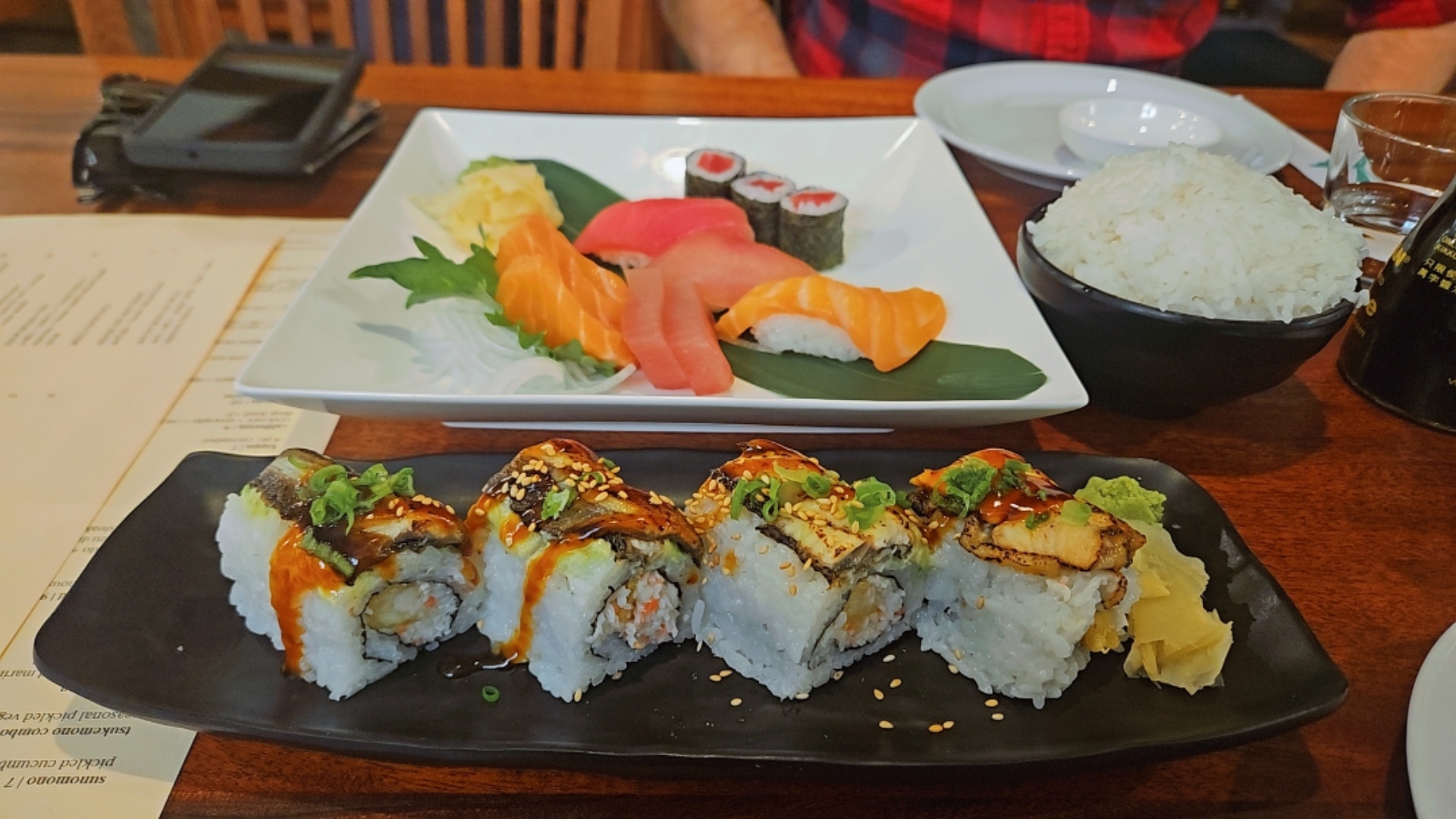 We ordered the teriyaki chicken for the kids (which I tasted and was definitely a 5/5), the truffle Brussels sprouts, and the calamari to start. The brussels were perfect and crispy and we ate the entire bowl, and the crispy calamari was crunchy and not at all greasy and perfectly seasoned. We also ordered from the raw bar, we got the Rainbow Roll At, high quality fresh fish without too much sauce taking away from the flavor) and the garlic salmon (oh my god). To finish we got some nigiri and the star was their 3 way sake which had the salmon nigiri topped with crispy salmon skin and salmon eggs.