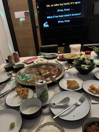 Went with friends to do the karaoke & hot pot room. You do have to call and rsvp in advance. There are 3 options ranging from $40-$70, the menu they give the prices are not updated. They also didn’t tell us that because we are a group of only 3, that we had to do the second most expensive option which was option B. A little disappointing. I don’t understand why but it was whatever. We got the Thai tom yum and house spicy. This is one of the better AYCE hot pots I’ve had. Broth was super flavorful. Meat variety was good, thick and a lot of pieces. The vegetables had a wide range as well. I got the spinach thinking it was going to be a few pieces and it was like a whole bundle so beware if you go there lol. They also have variety of meatballs or fish balls. One of my favorite parts was the wide variety of drinks they offered that were FREE! It ranged from sodas, Thai tea, milk tea, coconut drink, grass jelly drink, sugarcane drink, water and more that I forgot. We drank so many drinks because it was free but the drinks were very tasty! The karaoke was simple, just a connection to YouTube on the phone which is more simple to control. The microphones kept dying but they’d just change the batteries real fast. I do wish the room was a little more soundproof as I can hear my friends singing from the cashier area and further. They also have a bar where you can make your own sauce, grab your own fruits and utensils. They also exclusively have a private VIP bathroom. It’s actually cool because it blends into the wall and it’s cute and super clean. I did not see the public bathroom for the regular guest if you’re just eating hot pots so I can’t compare lol. I’d say another disappointment was that they automatically charged us 18% when we were just a group of 3. They didn’t specify that to us while in the room or on the menu. They just charged us that which was very shocking when we got the bill. Usually most places charge for that when you’re a group of 5+. There’s also a call button that they have for the VIP rooms and they’ll come right away. Lots of options for appetizers. Everything was super flavorful and hot here! Can’t wait to make it a regular spot.