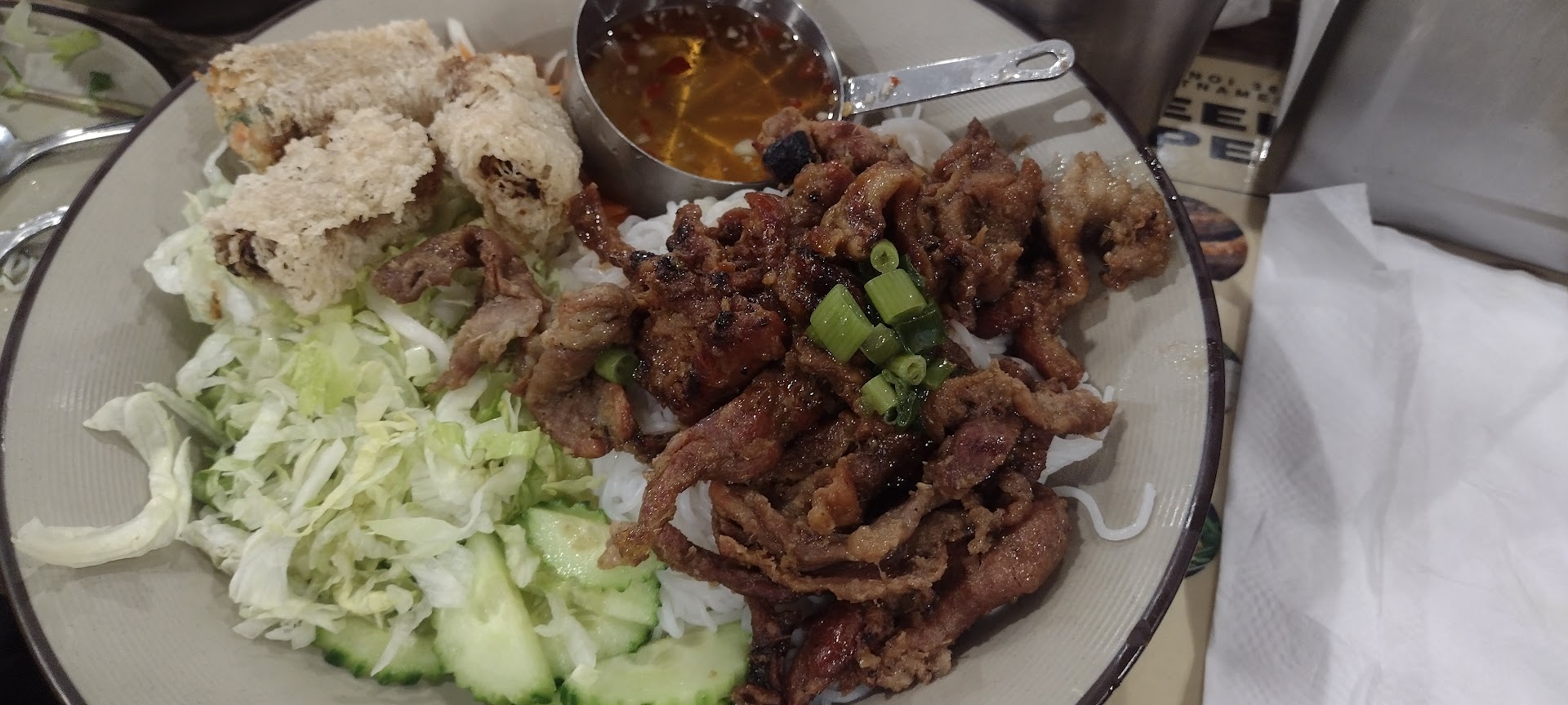Eating the pork noodle bowl with net rolls was fantastic. Its even better in the restaurant. The net roll was fried to perfection and the pork was well seasoned and tasty. Not only that though, the noodles absolutely fire, I don't know how or why but they were dry. Most Vietnamese cuisine, I usually notice the noodles are a bit dry but not Hanoi 36 streets. Highly recommend my dish. I even hear the pho is good too, so I will be back eventually to try it.