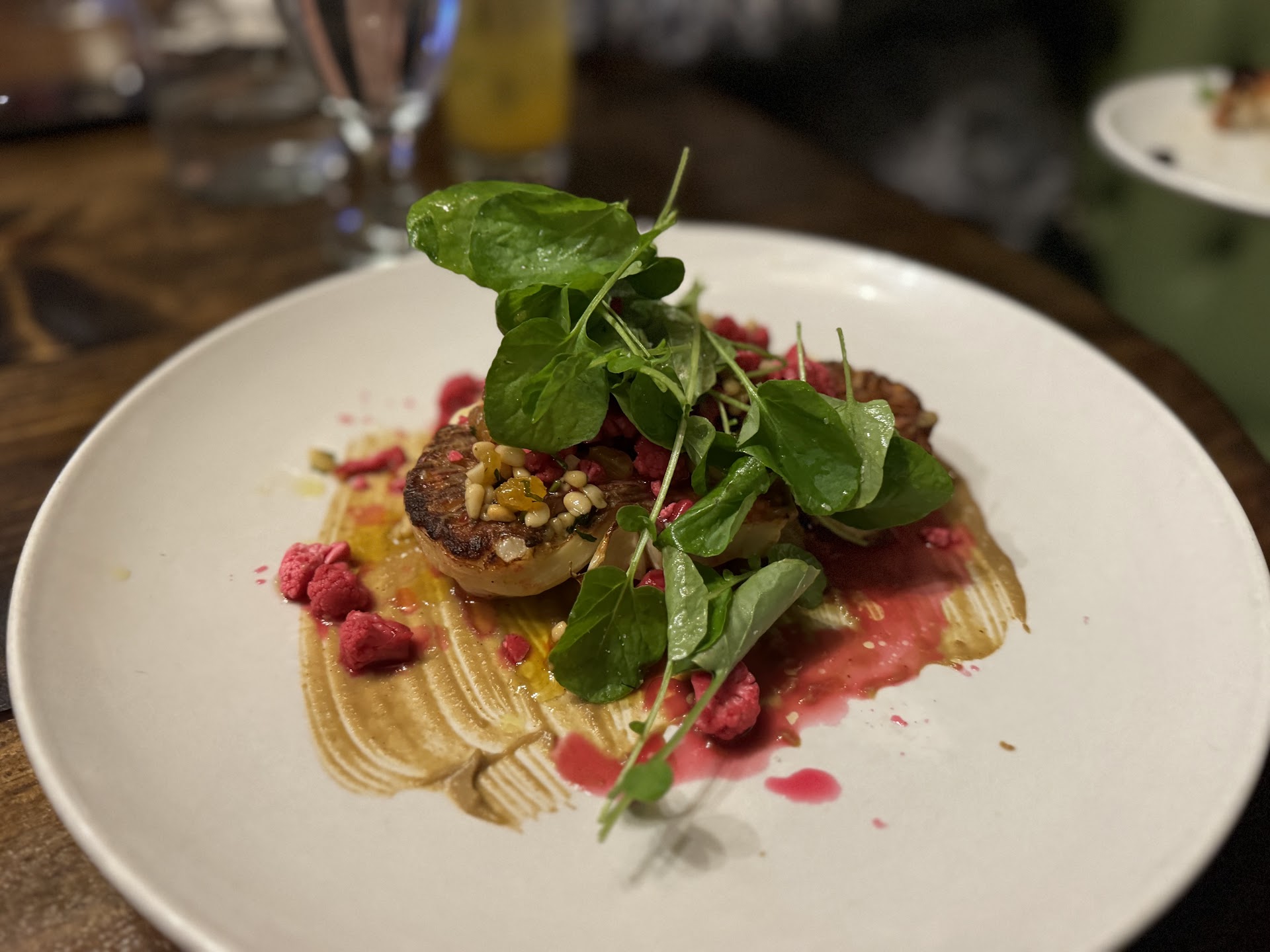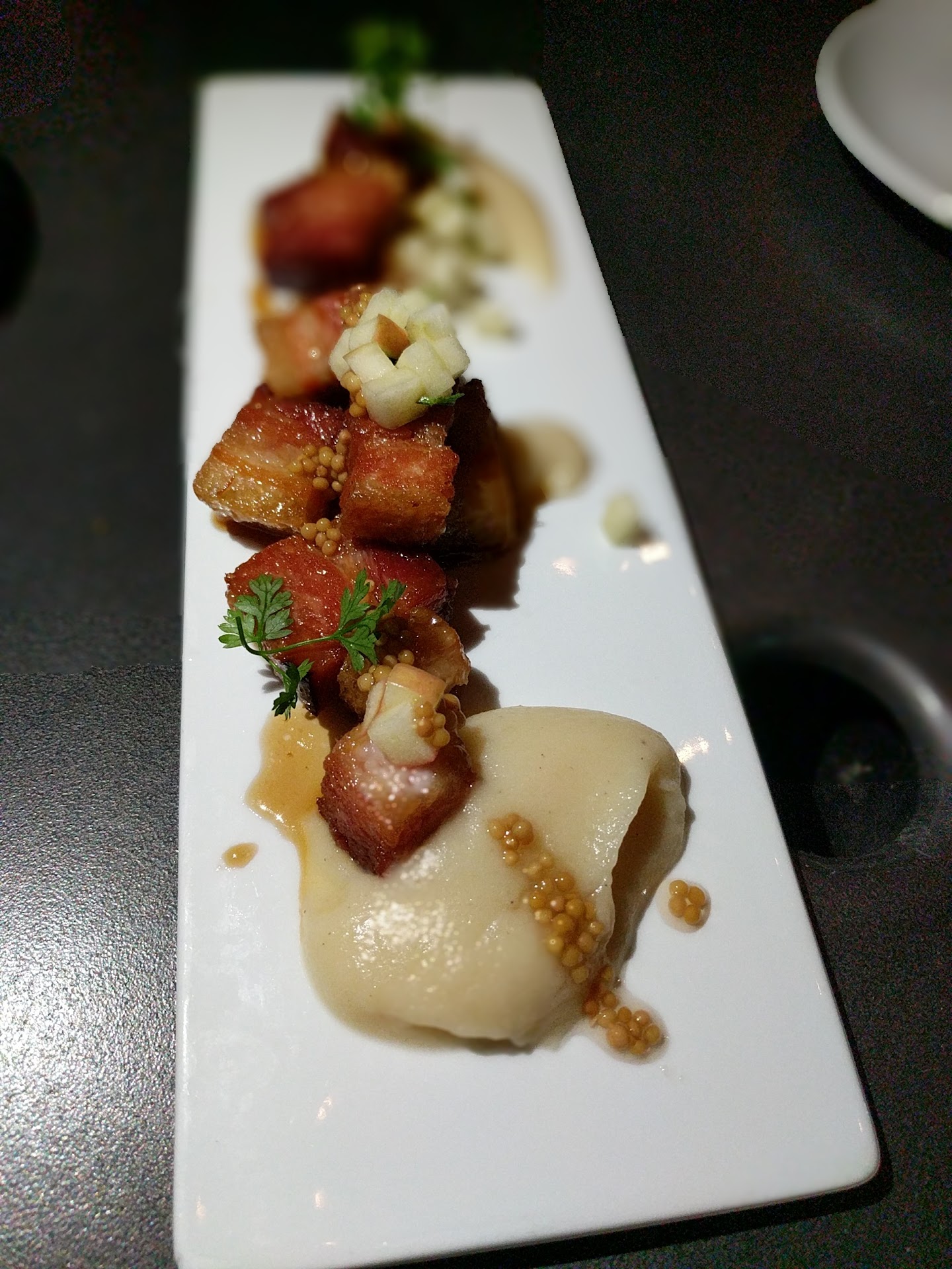 Our first appetizer: CRISPY PORK BELLY BITES $9 Sherry Maple Gastrique, Brown Butter Celery Root Puree, Marinated Apples. Take a small bit of pork and apple then marry it with the brown butter celery root puree, and the deglaze sherry maple sauce. Take a deep breath though your nose and experiencing usual mix of flavors. Just the right mix of sweetness, saltiness, and cut with acidic balance. Small bites but huge flavors.