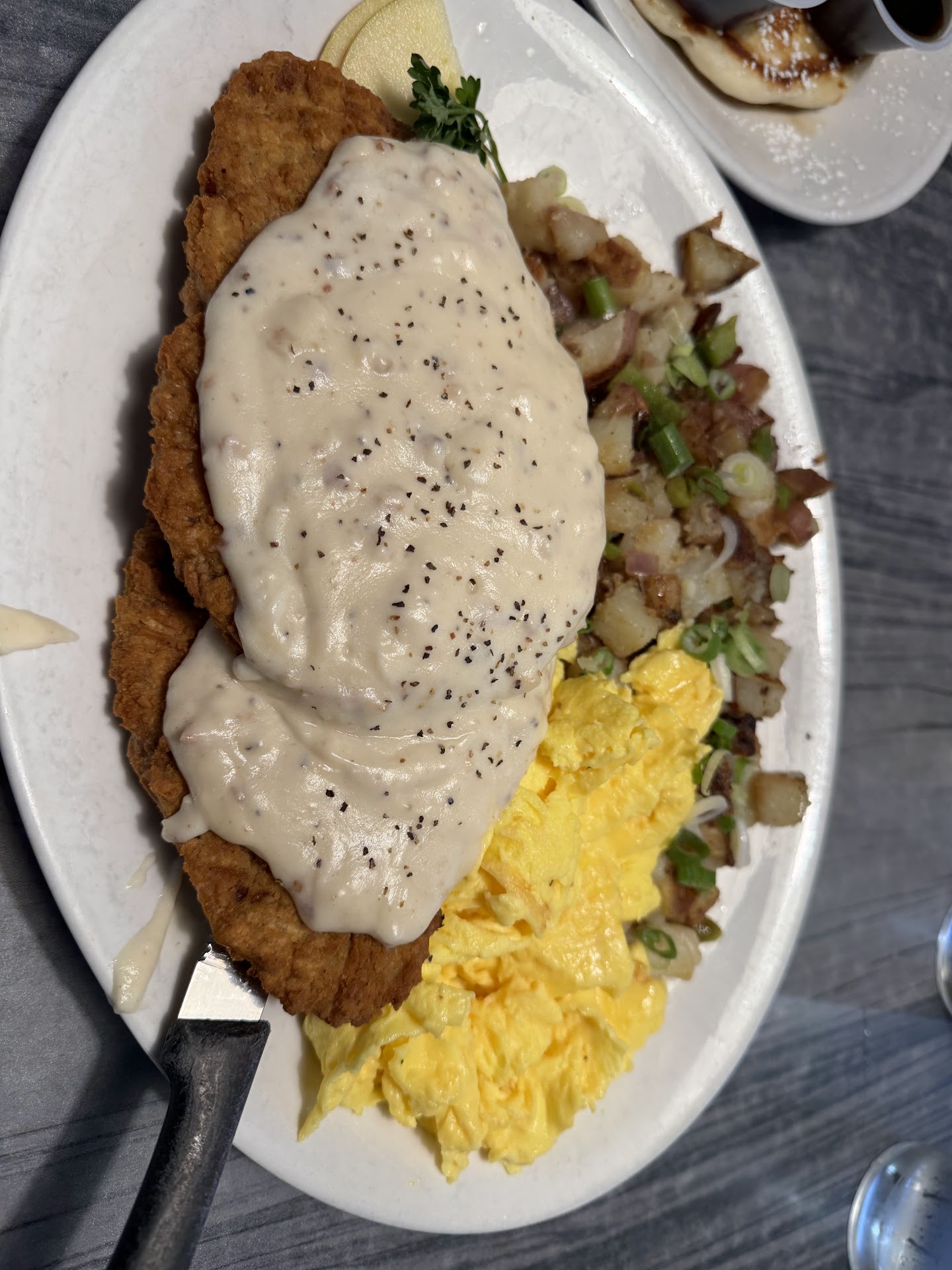 The food shows up - the potatoes look even undercooked from what I can see (STRIKE 1). I let the person dropping off the food know that they are to be crispy. She takes both plates back to the kitchen. Now, many minutes later of course, they bring back the plates with crispy potatoes. NICE. However the chicken fried stake is at best warm (STRIKE 2). I then notice my eggs are scrambled, not what I ordered (STRIKE 3). I wait and wait for my eggs. I finally get the young man's attention. He could not comprehend what he had happened with the order (STRIKE 4). He now brings my eggs cooked how I ordered them and they are again at best warm (STRIKE 5).