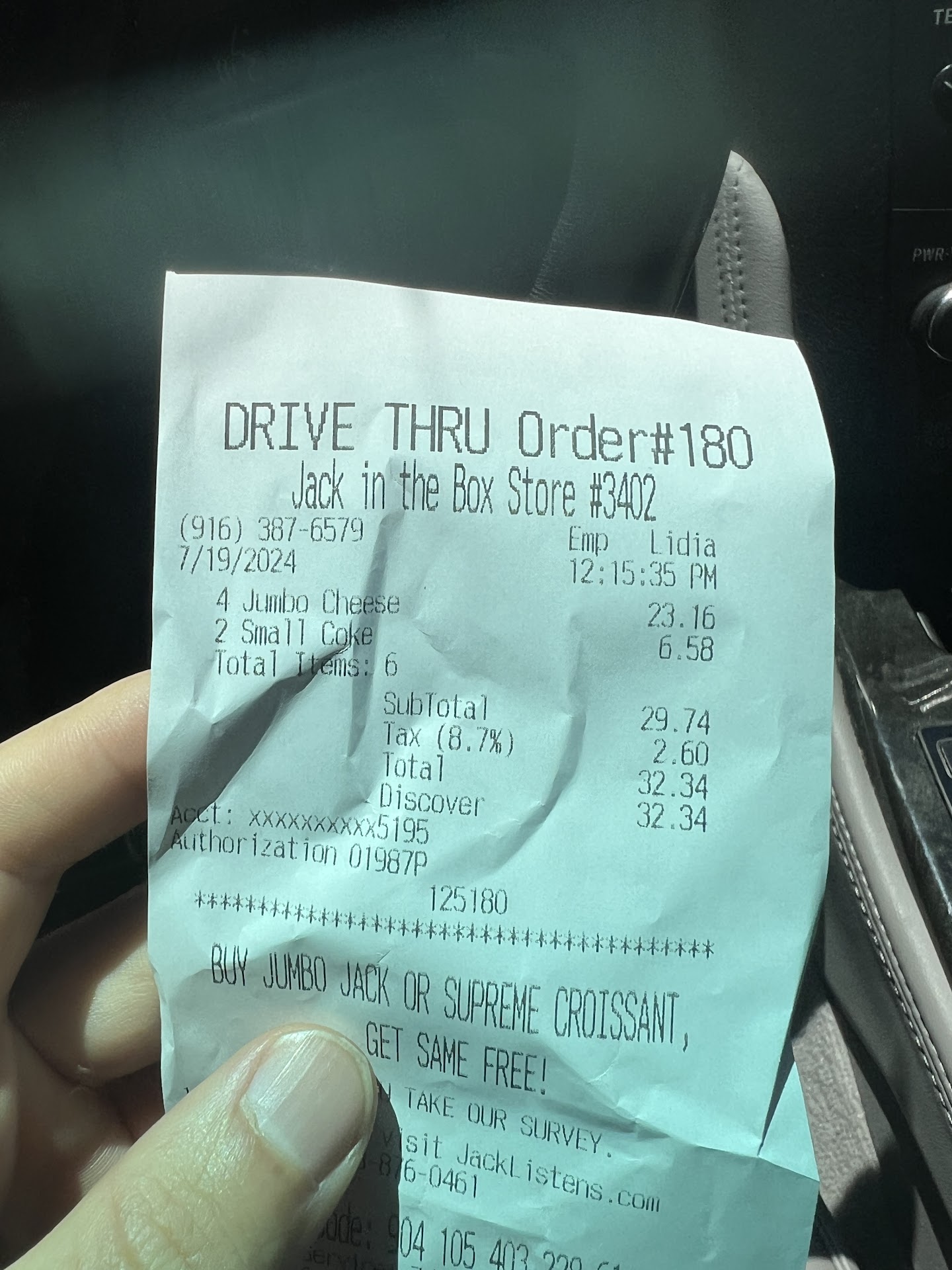 Read moreWent thru the drive thru last night ..we ordered a Jumbo Jack with no pickles & a order of tacos..the guy working the drive thru was slow to respond & kept repeating the order wrong..after a few attempts he finally got it right. We then pulled up to the window..at the window he again asked what we ordered..we repeated our order a bit irritated by this..he asked again..my boyfriend who has damaged vocal cords asked him if he needs to speak "Mexican" in order for the order to be right. The guy working the drive thru then refused to give us our order and told us to leave. My boyfriend got out of the car and asked him why? The response was because of the "racial Mexican remark"..we told him about my boyfriend's vocal damage & to please give us our food. He refused..and closed the window demanding we leave & that he was not going to serve us. My boyfriend knocked on the window & asked for the manager or someone else..the employee then got confrontational as if wanting to fight....refusing service. We left without the food we...