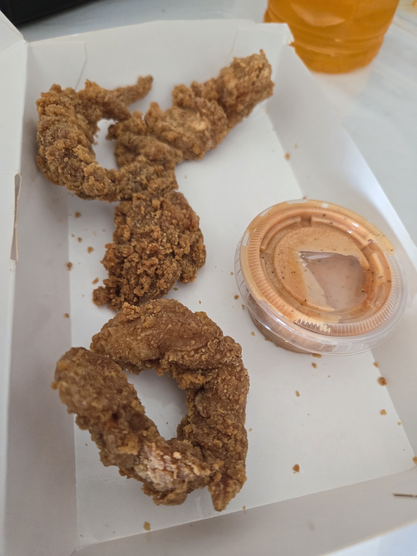 The chicken strips were almost cold and incredibly undersized. The chicken was okay but flavorless. I got the spicy chicken and it just tasted like spicy not like flavor at all. And it was maybe a step up above Wendy's spicy, I barely even registered the heat. I paid extra for the adobo rice, and the texture was terrible and it tasted like pretty much nothing. The fries were better than the rice.