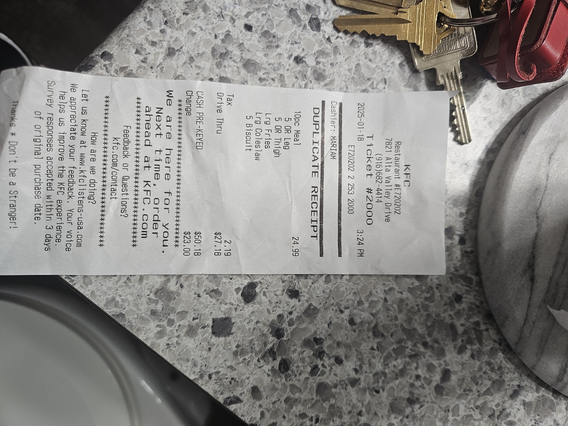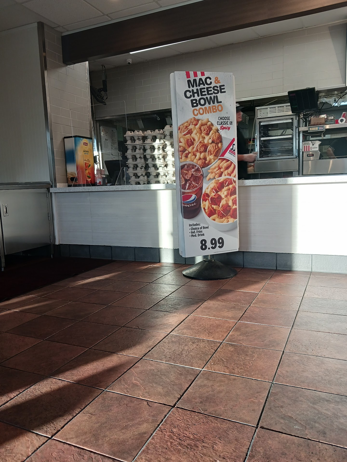Read moreGot the $20.00 fill up box for the first time the other day, after not visiting this peticular KFC, or any other for years. My last visit I got a breast & biscuit no cookie, and I remember it costing close to $7.00. My fill up box came with one corner of the box not secured, so I took the opportunity to check it, while the cashier/ food handler (no gloves) was present. Was going to ask if the fries were fresh after seeing her struggle to scrape up two partial scoops, but I didn't. Instead I took my two finger and slid the present fries over 2.5", and stated to her there was a hole there. She responded that was two scoops and she would give me more. She in fact did. She managed to scrape up approximately 3.5 more fries. Now for the kicker: you know how when you cook chicken you normally remove the feathers, well I unfortunately paid for one wing still wanting to fly, or flap, or whatever it chickens do with them while feathed. I discovered a feather on an extra crunchy deep fried tip. I might take a picture and post it as well. Still holding on to it haven't decided yet. Might start a Gofundme/Auction, and post for the...
