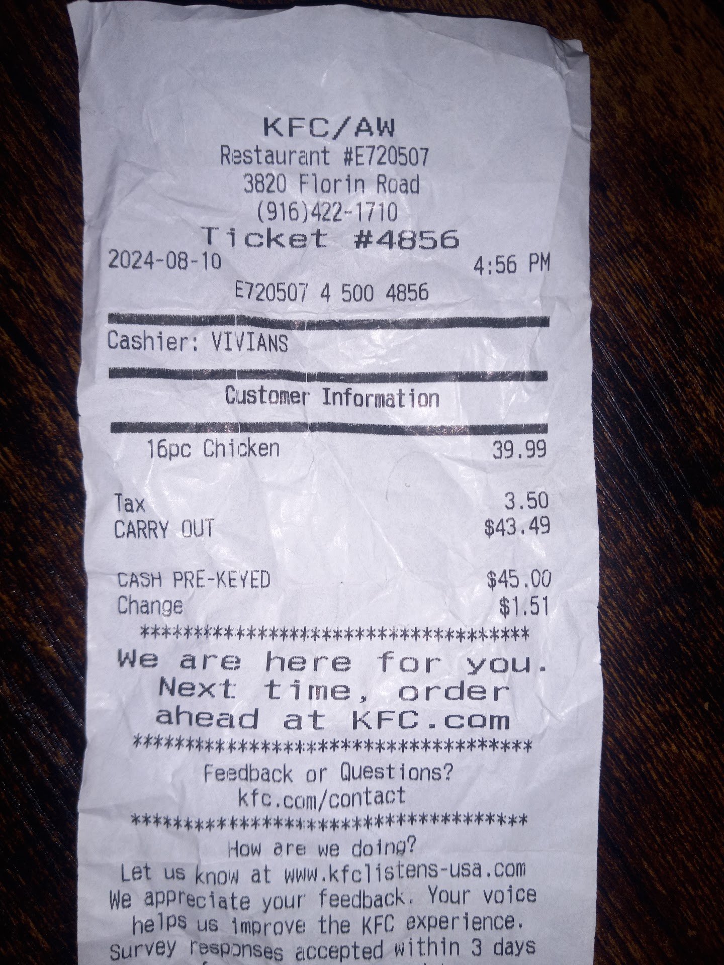 Read moreYesterday, I ordered a bucket of chicken & the cashier asked if I wanted Original or Spicy.. I was was surprised because at a different KFC location, they told me that they don't make spicy chicken.. So naturally I chose spicy, but then the cashier said it would be a 15minute wait.. I ended up waiting 30 minutes for something I didn't order... When I got home, I realized they gave me original recipe & these were mostly chicken legs with one thigh & one wing..